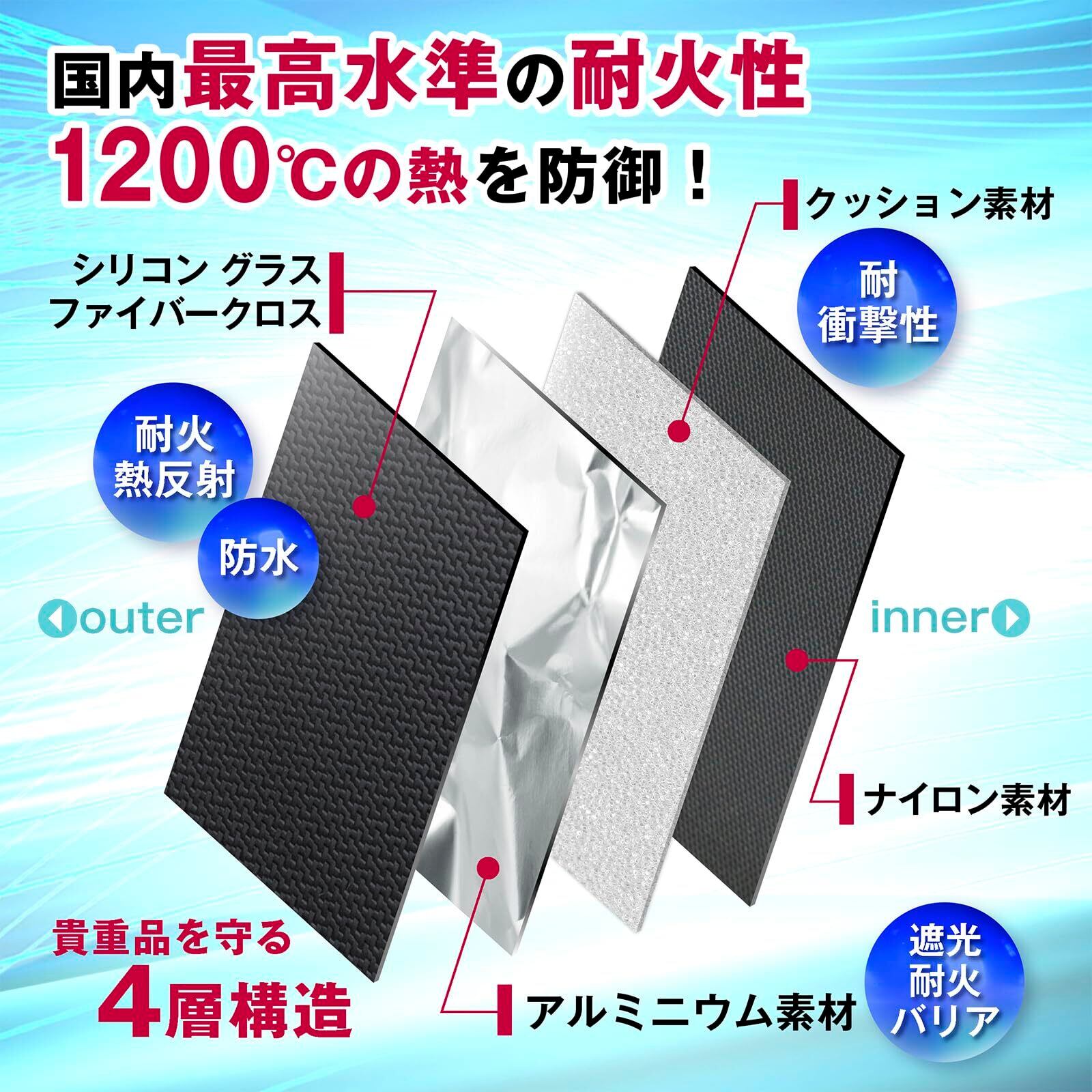 【耐火バッグ】弊社の耐火ポーチは国内耐火試験を合格し国内最高水準の耐火性が認められた商品です。4層構造で1200℃の熱まで防御でき貴重品を守ってくれます。