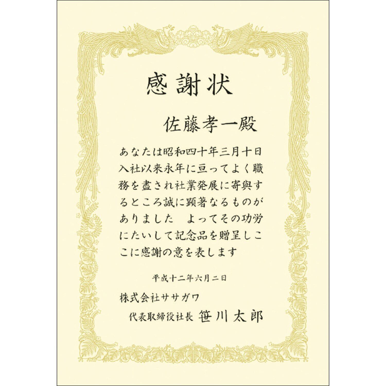 美しい金色の輝きを保つ特殊印刷をした賞状。高級感あふれるクリームタイプ。新たな印刷技法を用いているのでレーザープリンタやその他の出力機に対応。賞状用紙にふさわしい気品と深みのある風格が縁飾りに表現されている。従来からの手書きや通常印刷(凸版やオフセット)にも使用可能。