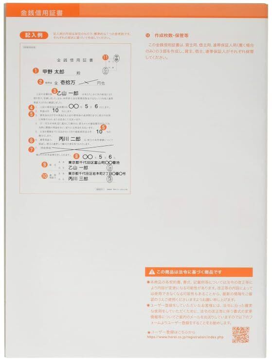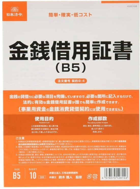 【新着商品】日本法令 注文番号 契約9-4 /金銭借用証書(B5/ヨコ書)