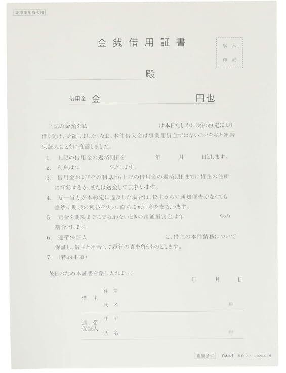 個人間でのお金の貸し借りに必要な事項を定めてあり、借主が記入押印し差し入れることで作成できる簡易な書式です