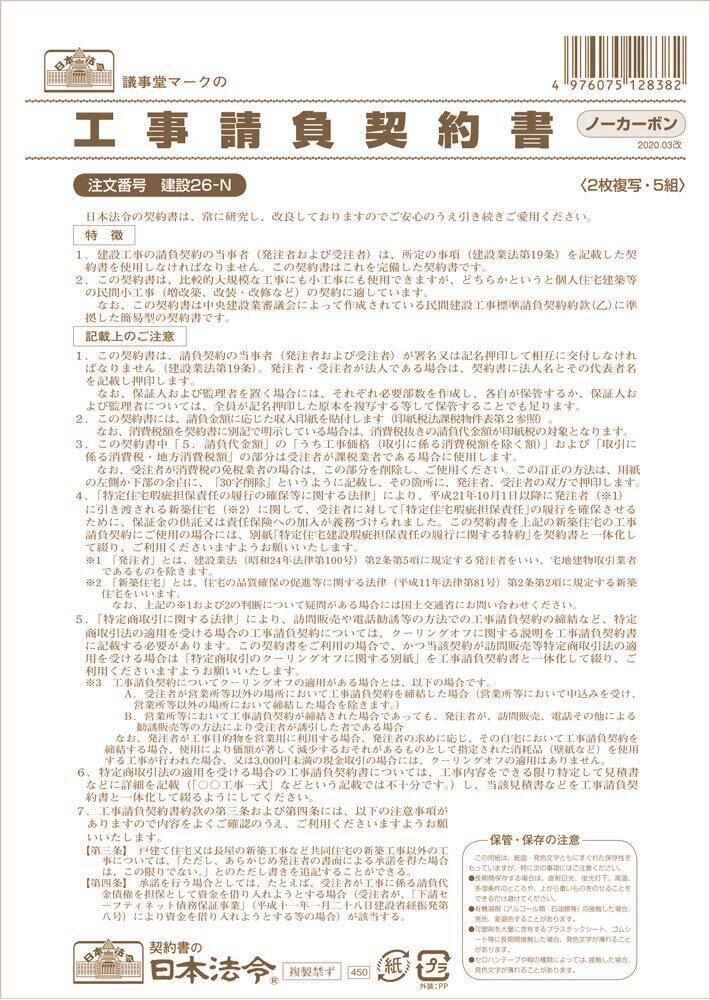 【在庫処分】日本法令 工事請負契約書(ノーカーボン・2枚複写)(請負金額が比較的小額の小工事用)(B4・5組) 建設26-N