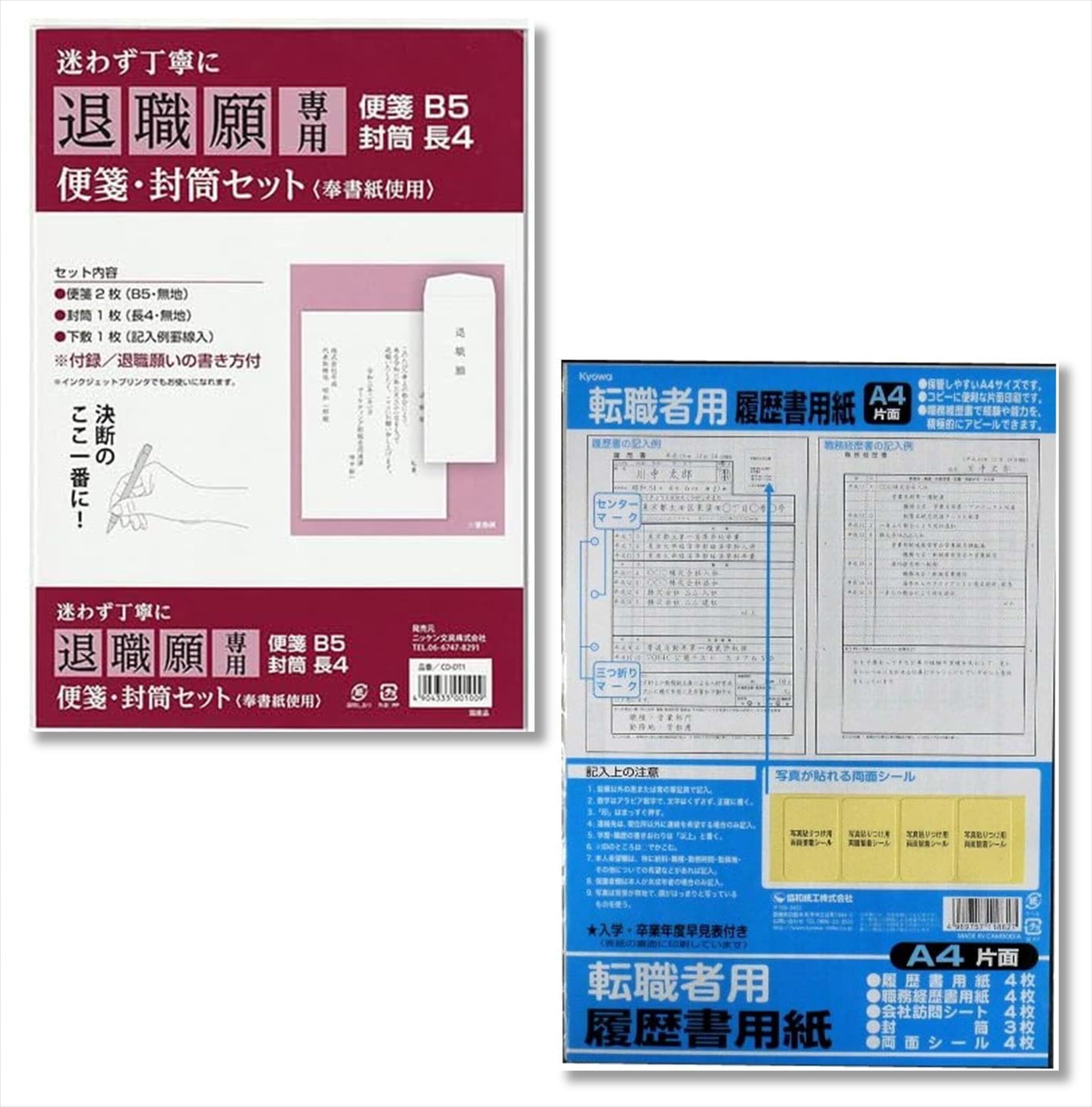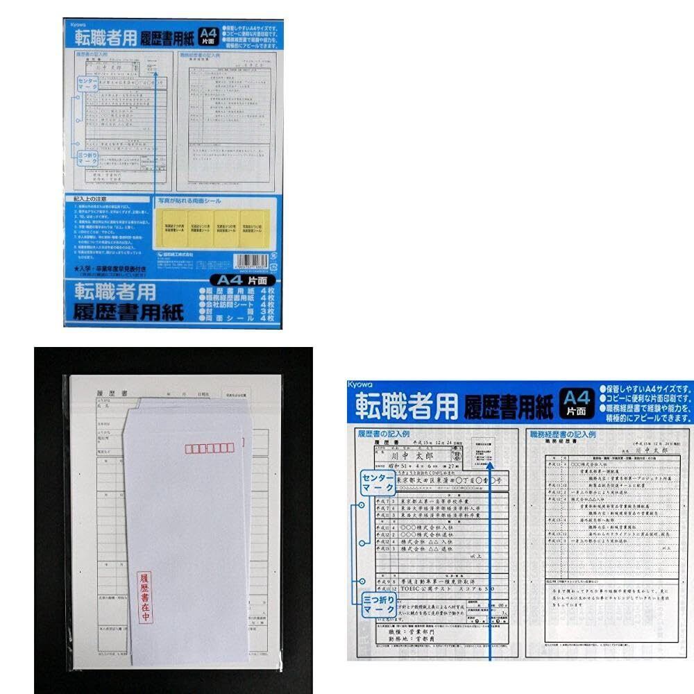 ベーシックなA4サイズの履歴書4枚、職務経歴書用紙4枚、会社訪問シート4枚、封筒3枚のセット。また、両面シール付きなので写真が簡単に貼れます。