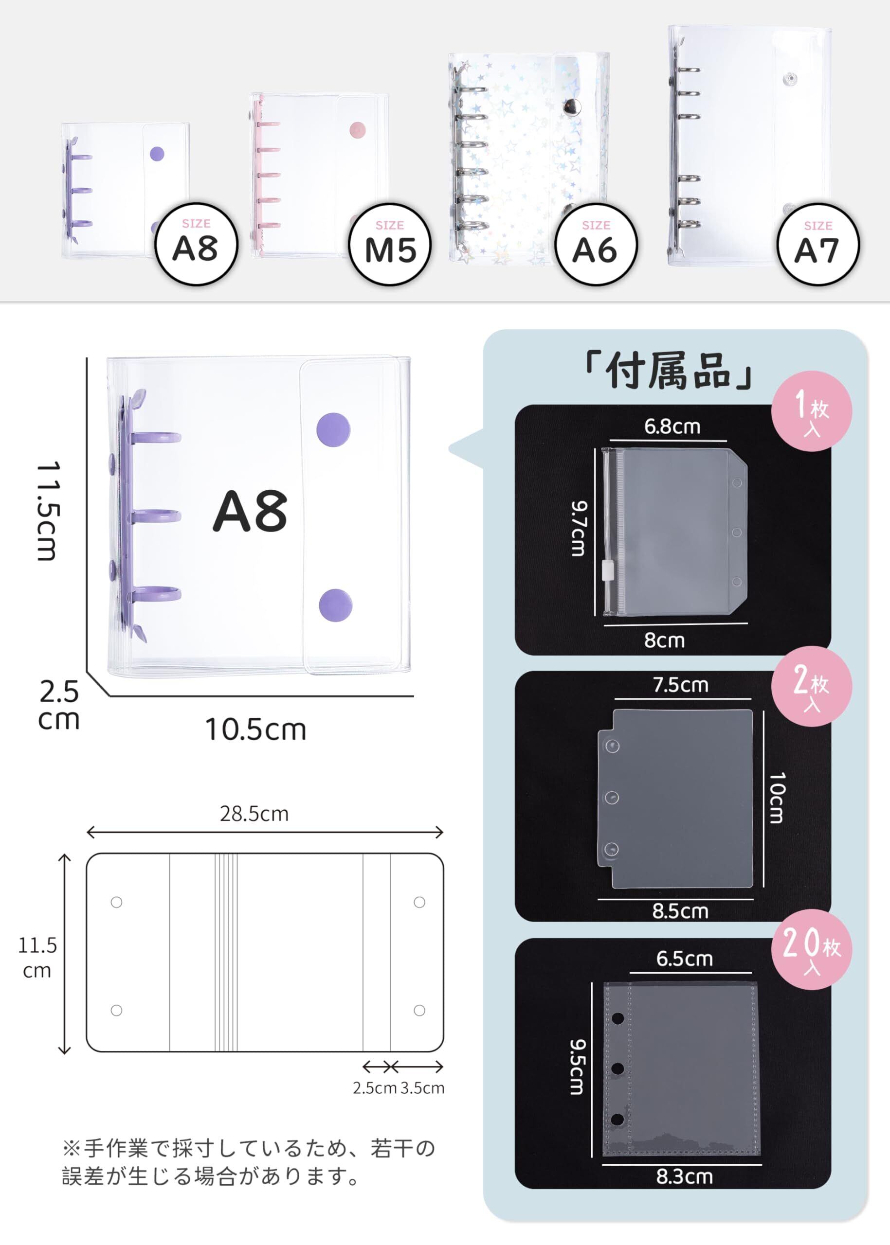 【A8サイズのミニシール帳】本体サイズ(約):縦11.5cm×横11cm×厚み2.5cm。セット内容:❶カードリフィル×20枚 ❷下敷き×2枚 ❸チャック付きポケット×1枚。内寸約6.6cm×9.3cmのカードリフィルは、一般的なトレーディングカードや写真をしっかり収納できます。穴のないカードや写真もバインダーに追加できます。※紙のリフィルは付属していません。※シールは別売りです