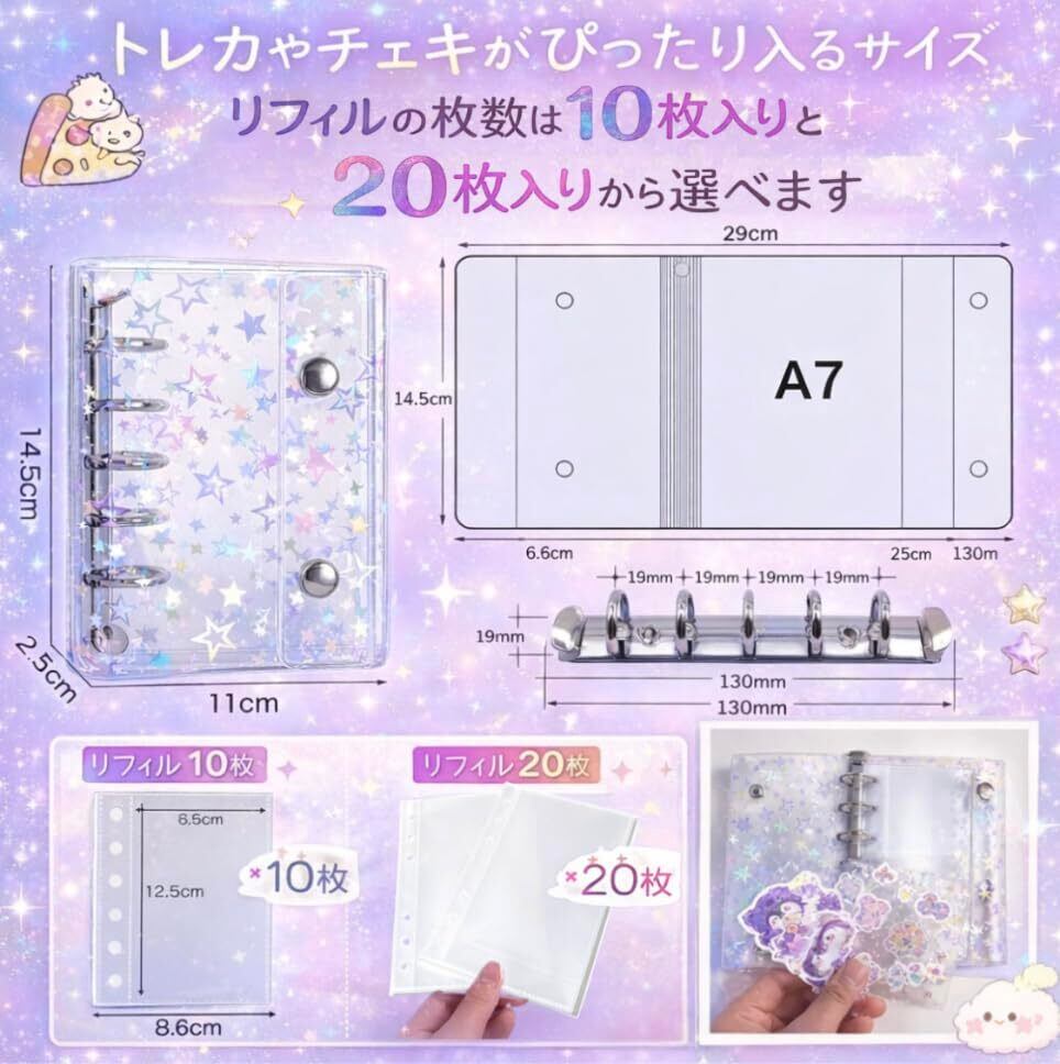 6)仕様 ・カラー:星柄入りクリア ・サイズ:本体 約14.5×11×2.3cm、リフィル 約8.6×13cm(10枚入り) ・バインダー:ミニ6穴