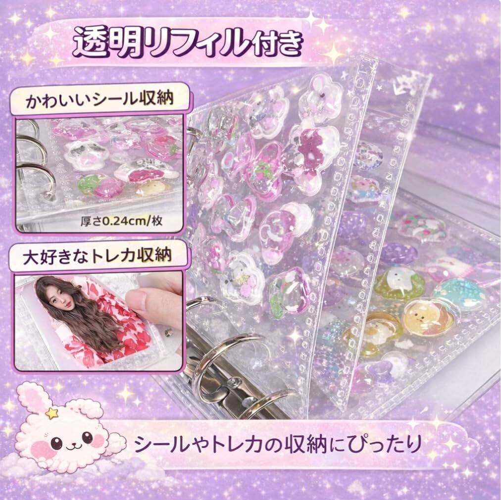 1)キラキラ輝く透明シール帳 ホログラム風の星柄を散りばめた透明バインダーは、光の角度でキラッと輝き、コレクションしたシールをより可愛く見せてくれる“見せる収納”が楽しめます。通学バッグから取り出すだけでも気分が上がるデザイン。自分だけのシールブック作りにぴったりです。