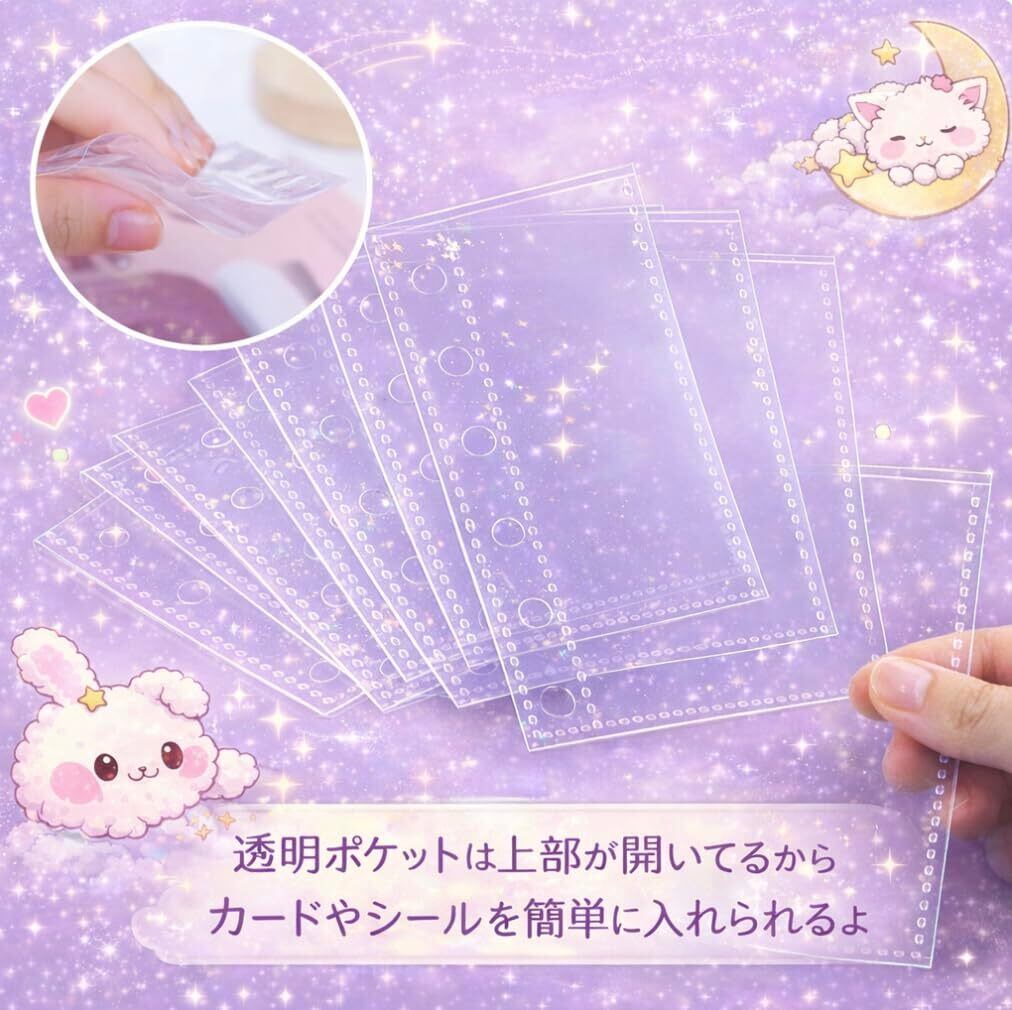 3)透明スリーブ10枚付きですぐに使える 到着後そのままセットして使える透明のリフィル10枚入り。出し入れしやすく、大事なシールを汚さず綺麗に保管できます。スリーブは差し替え可能なので、自分のコレクション量に合わせて追加アレンジもできます