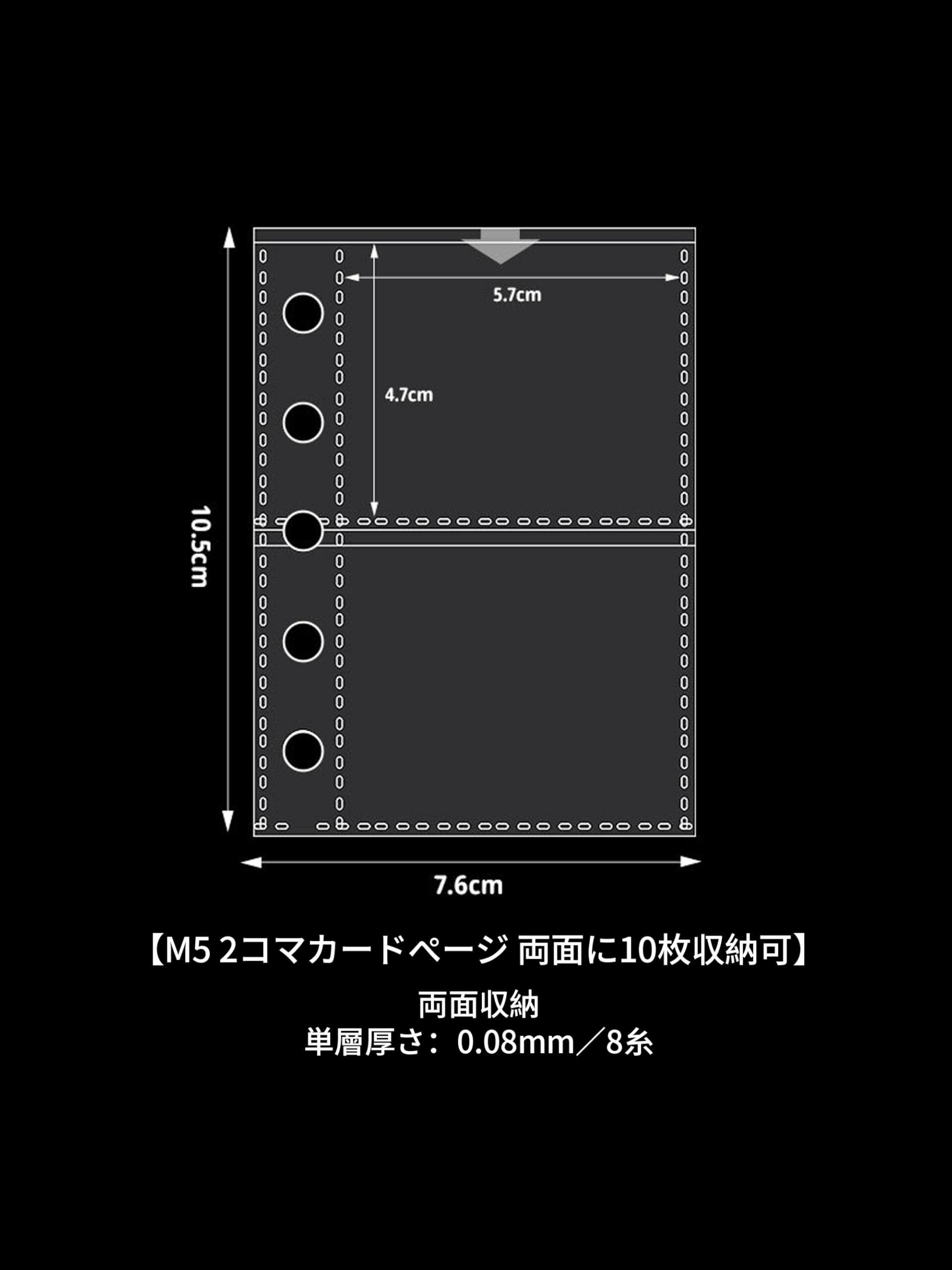 【製品内容】:M5 外装ケース+2 コマ両面収納カードページ 10 枚 【外装ケースサイズ】:12.6×9.5cm 【カードページ内部サイズ】:1 コマ(10×5.7cm);2 コマ(4.7×5.7cm) 【フリーバックル孔間隔】:19mm