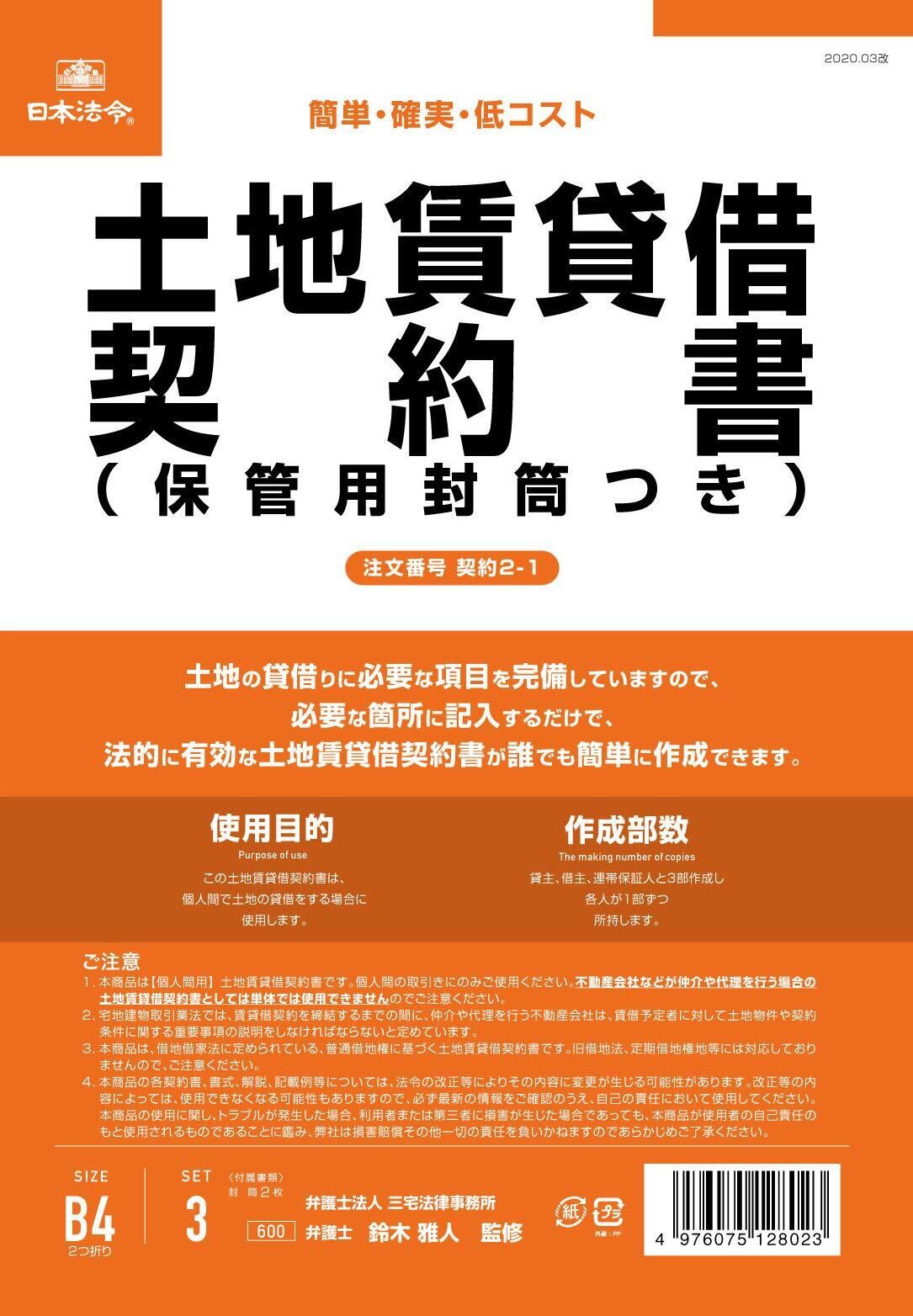 日本法令 土地賃貸借契約書(保管用封筒付き)(改良型/タテ書)(B4・3部) 契約2-1