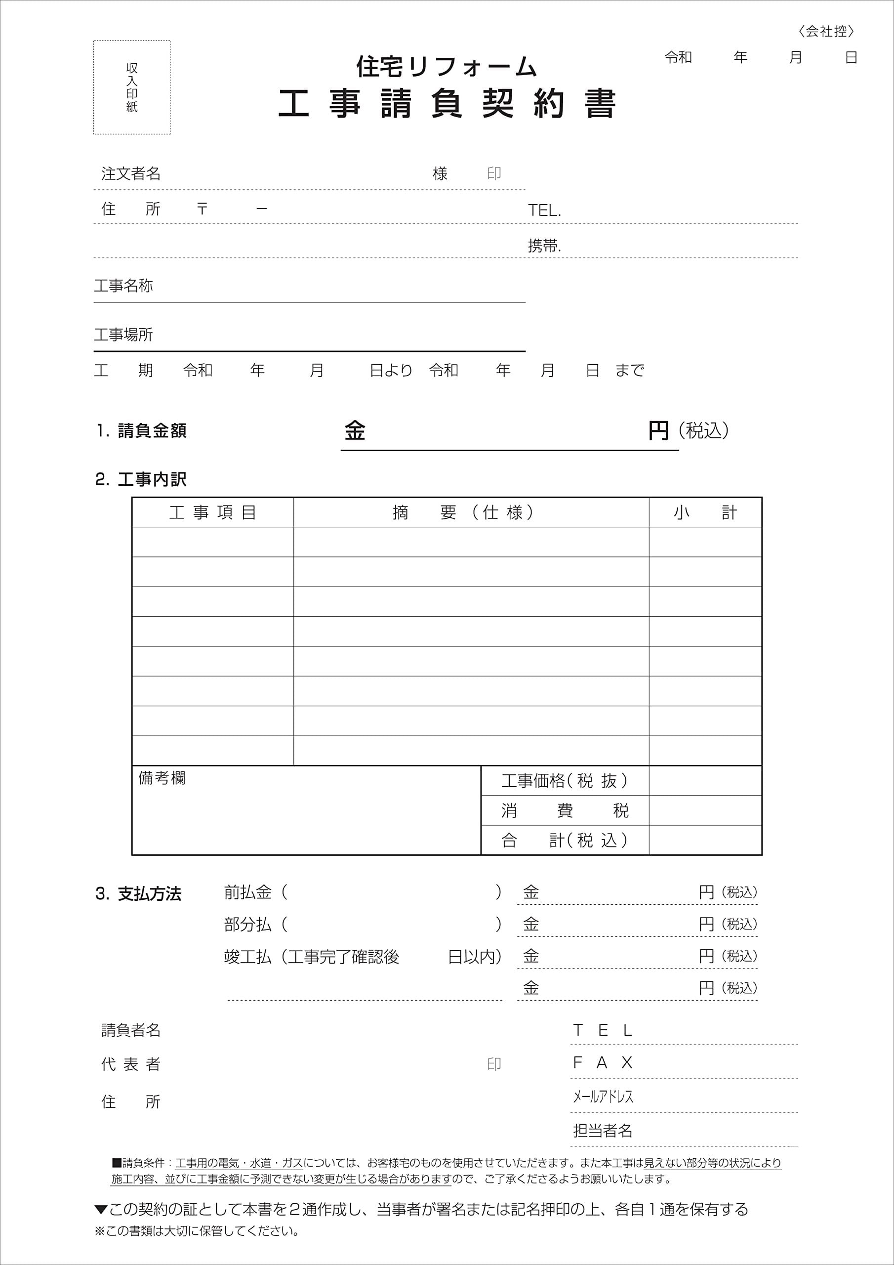 住宅リフォームに最適な簡易式の工事請負契約書です!