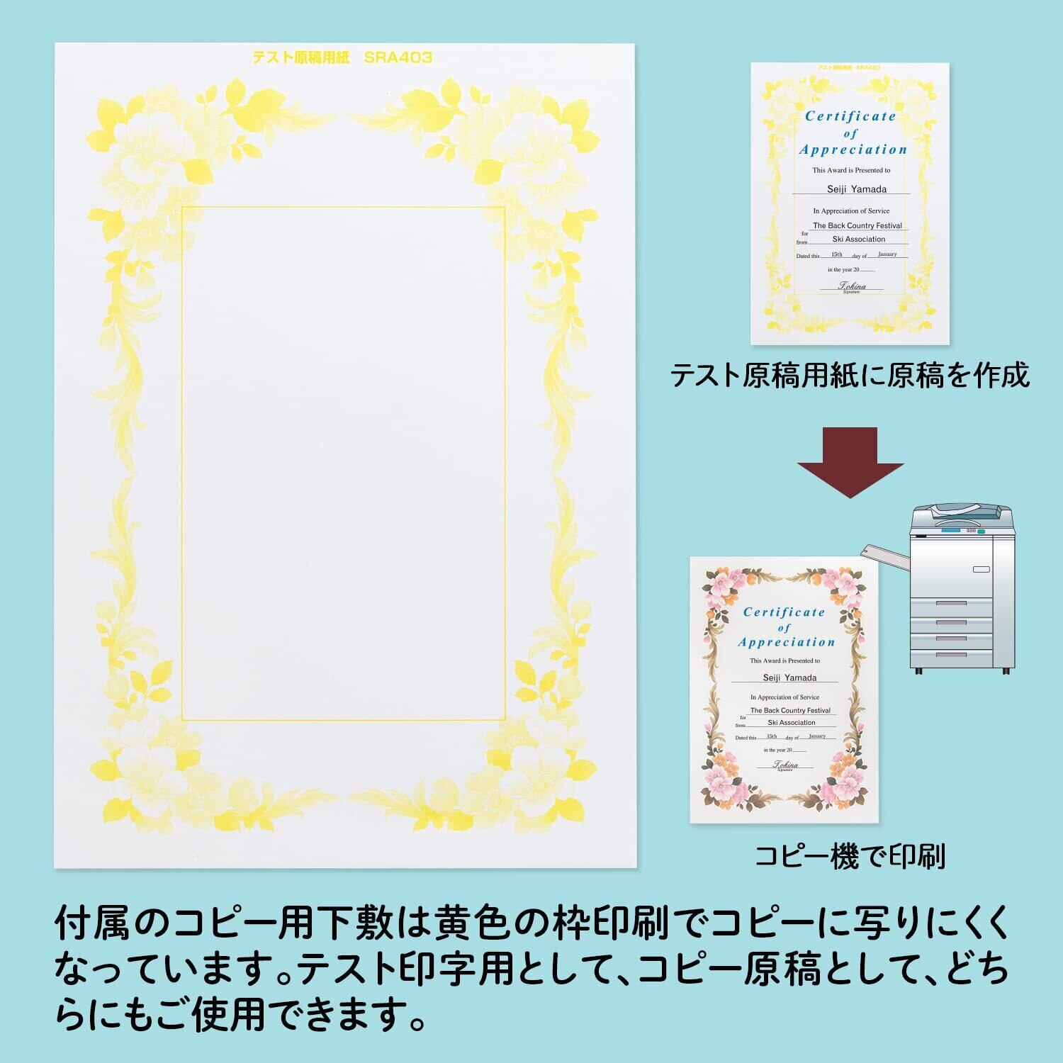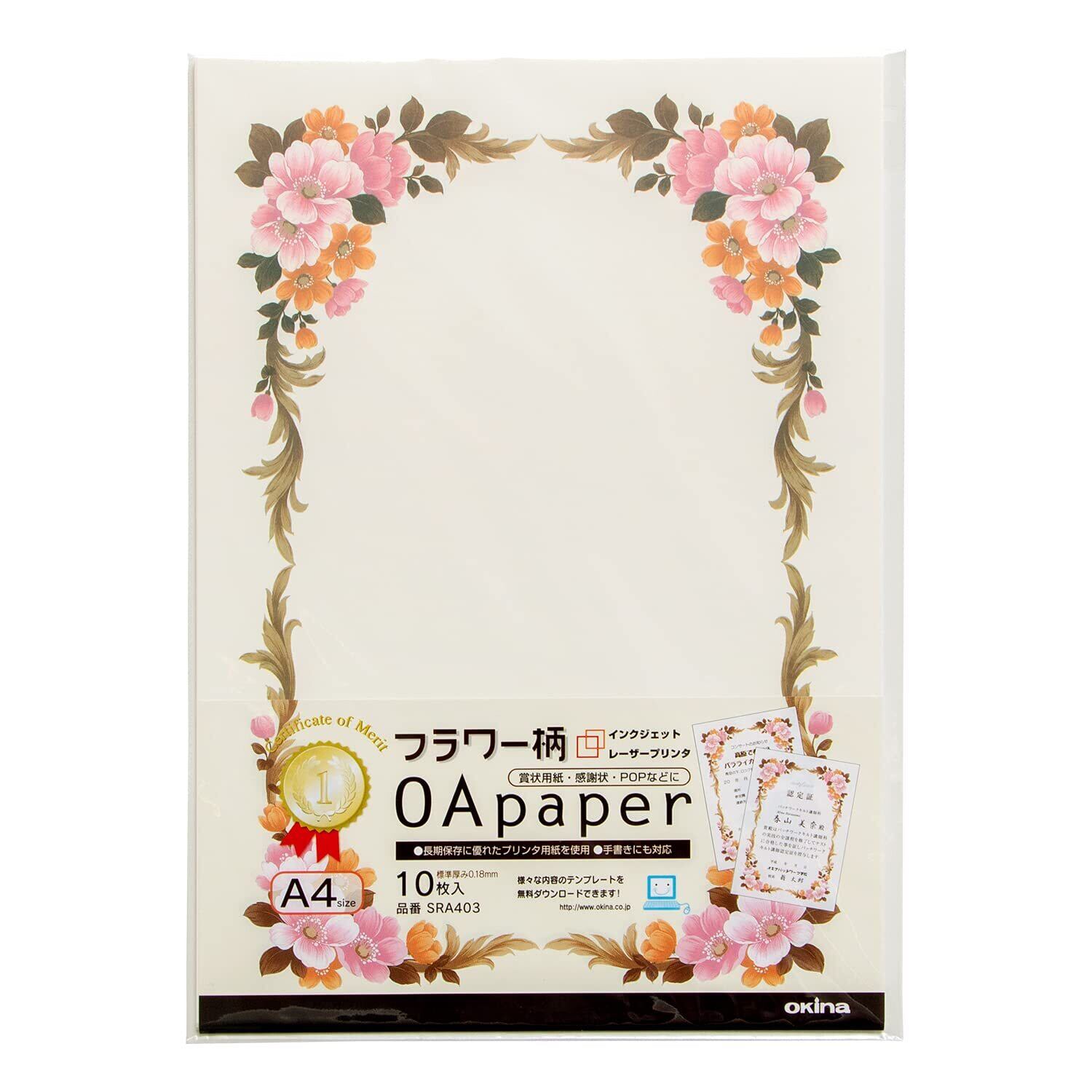 オキナ 賞状用紙 A4 横書き 10枚 フラワー柄 プリンタ対応 SRA403