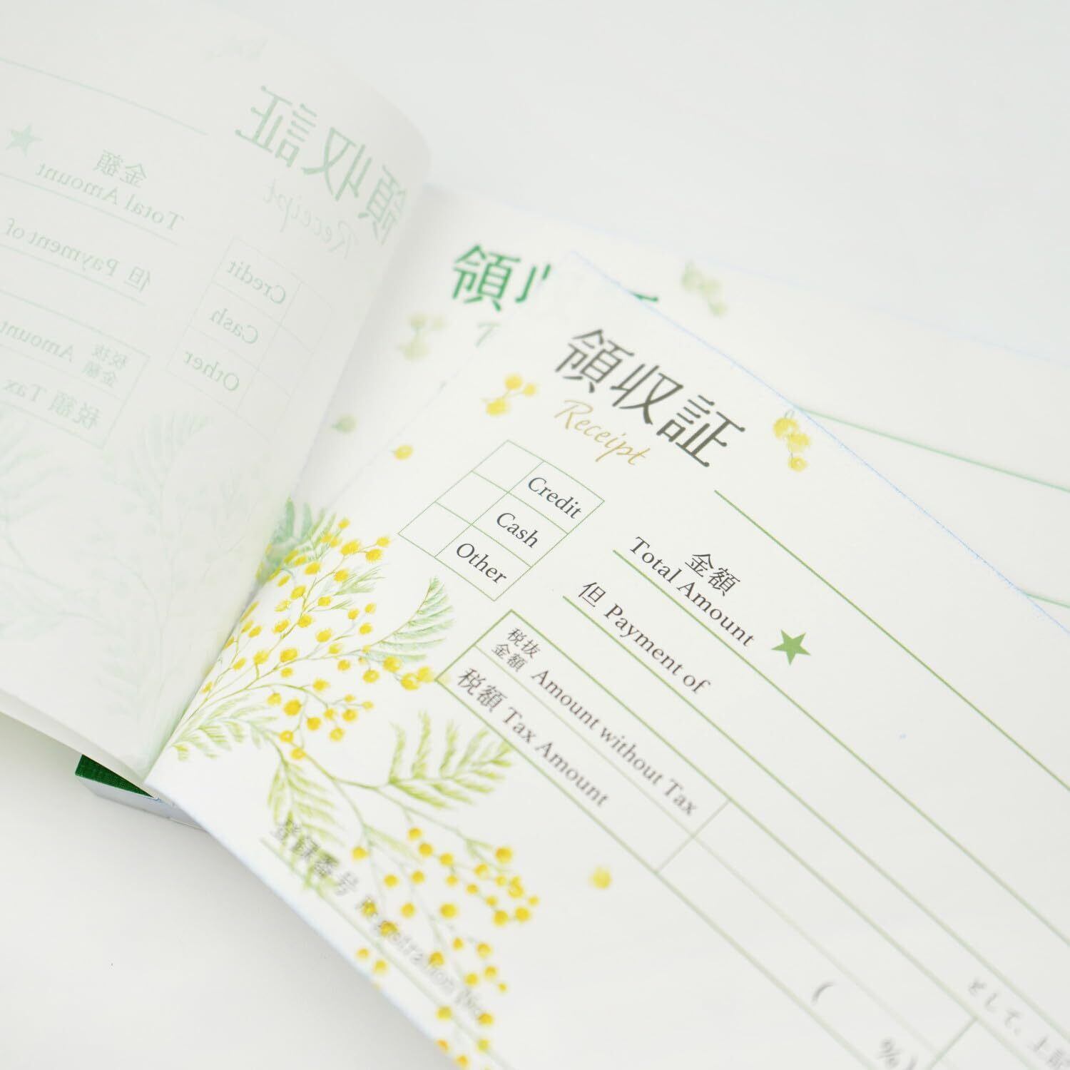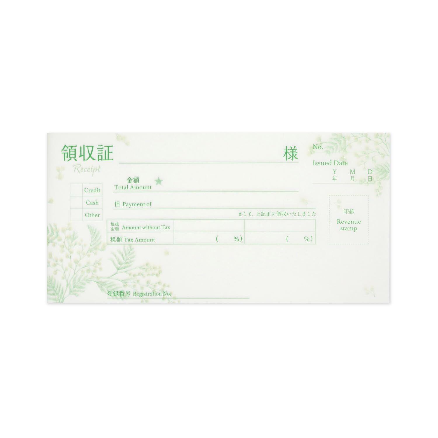 日本語と英語で表記された軽減税率・インボイス制度対応領収証。ノーカーボン・2枚複写式。40シート入り。インボイス制度に対応するよう適格請求書発行事業者の登録番号記入欄あり。野原に咲く草花をデザインしたカワイイ領収証になっています。飲食店や生花店、また、インターネットでこだわりの雑貨を販売される方などにも人気を得ています。