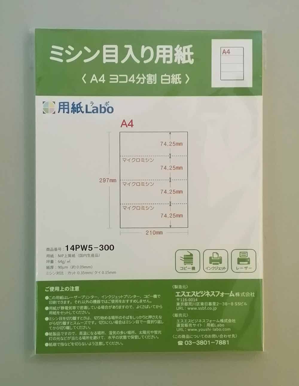 【用紙Labo】 A4 白紙 ヨコ4分割 55Kg (100枚) ミシン目入り用紙 マイクロミシン 用紙ラボ