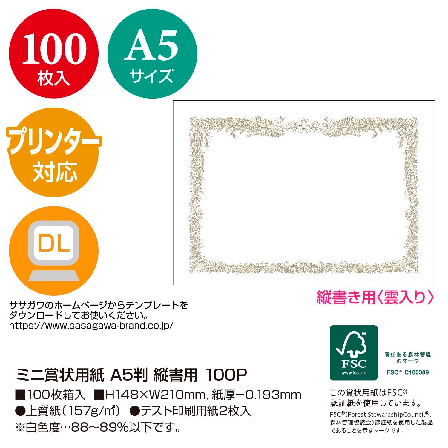 ササガワ ミニ賞状用紙 タカ印 OA対応 縦書用 A5 100枚 10-1650