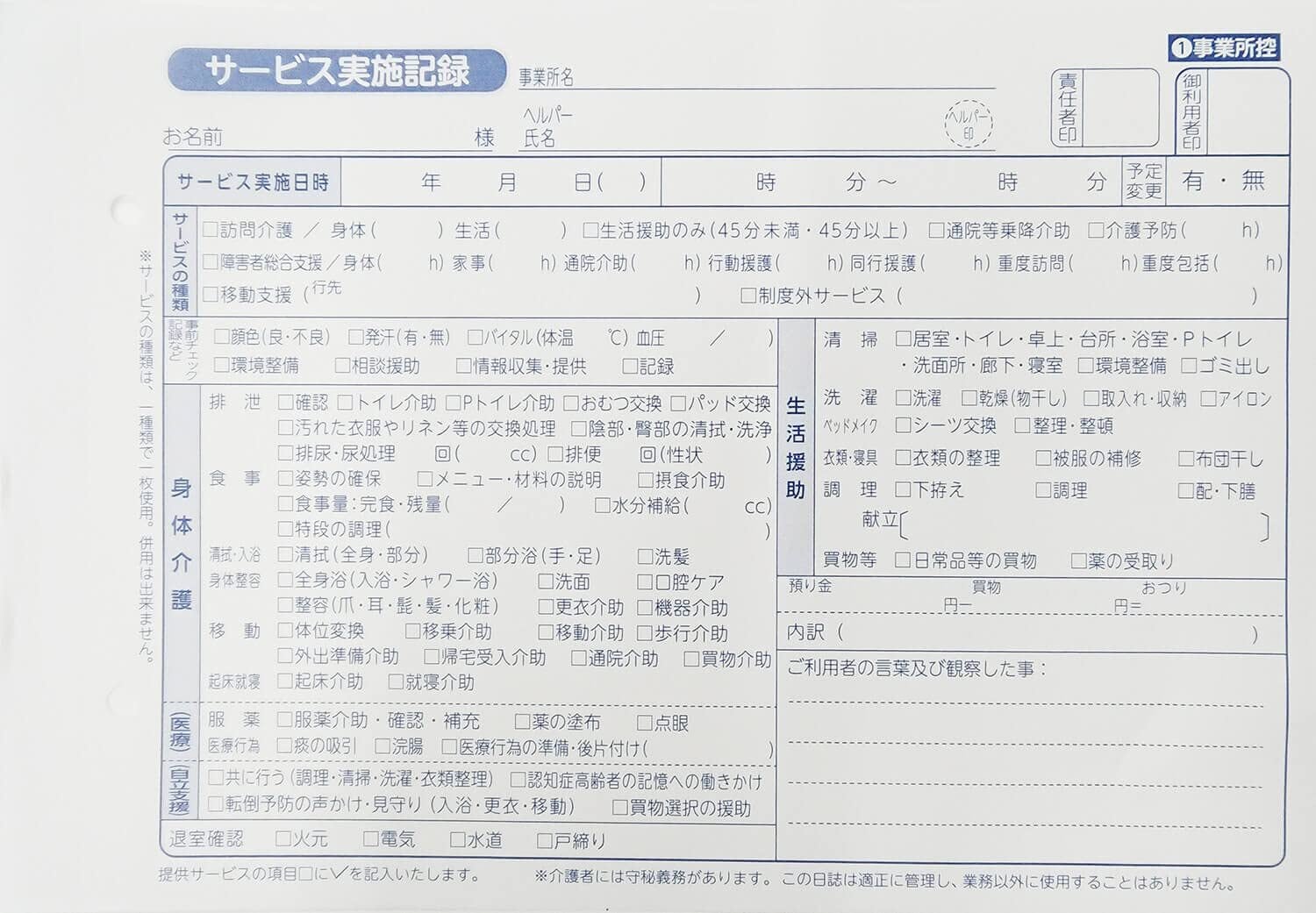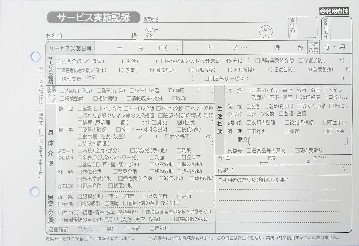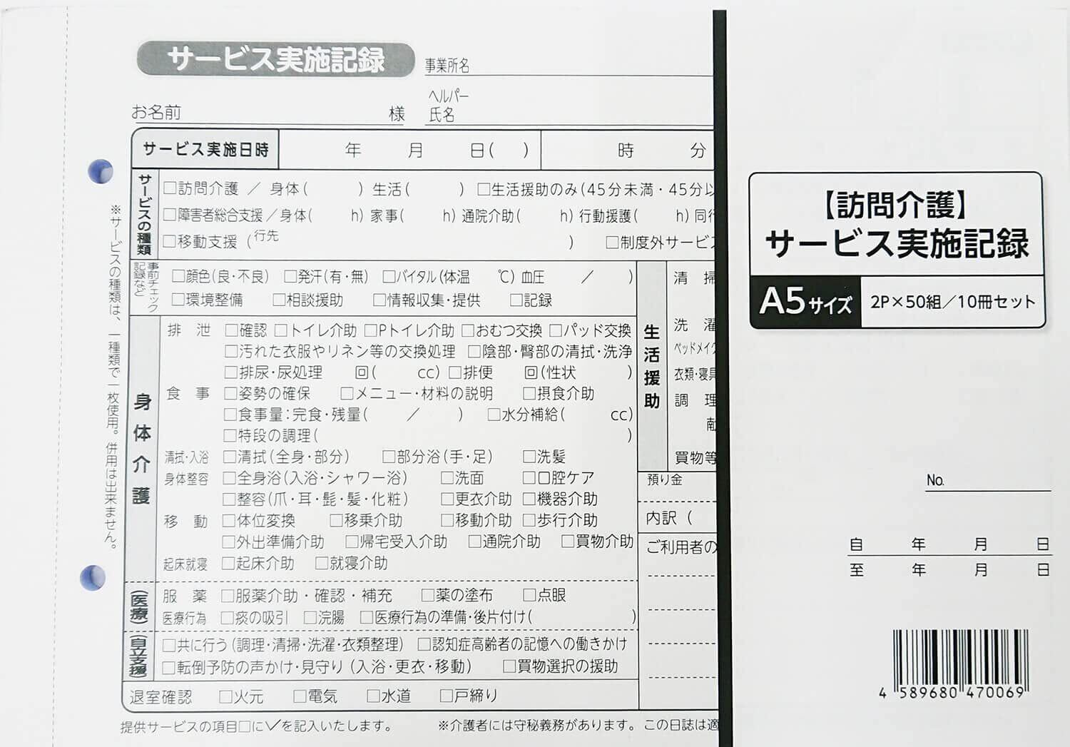 訪問介護伝票 A5 2枚複写 50組×10冊 訪問介護サービス実施記録 くじら印刷
