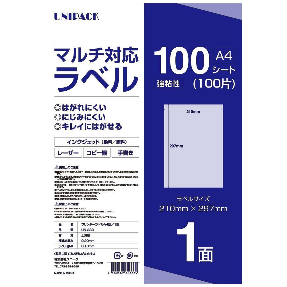 UNIPACK ラベルシール ラベルサイズ ノーカット 強粘着 宛名 納品 100枚 (1面(210X297mm)), un-333