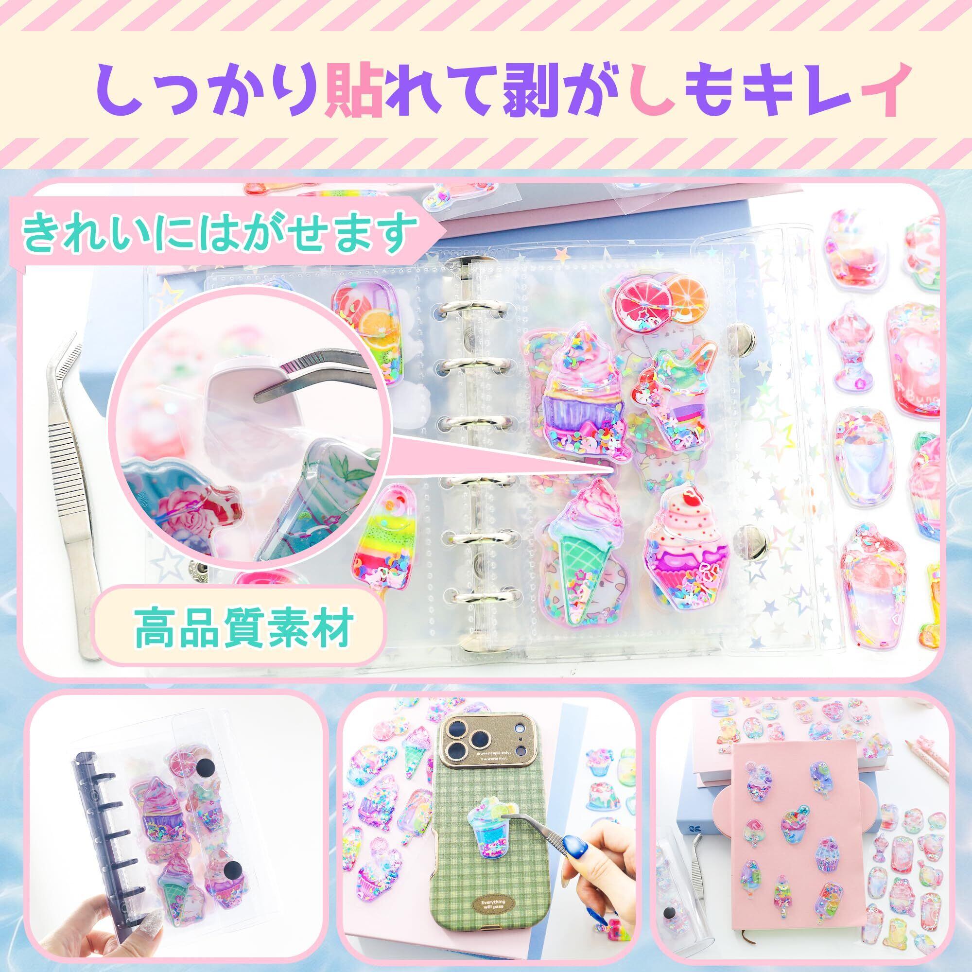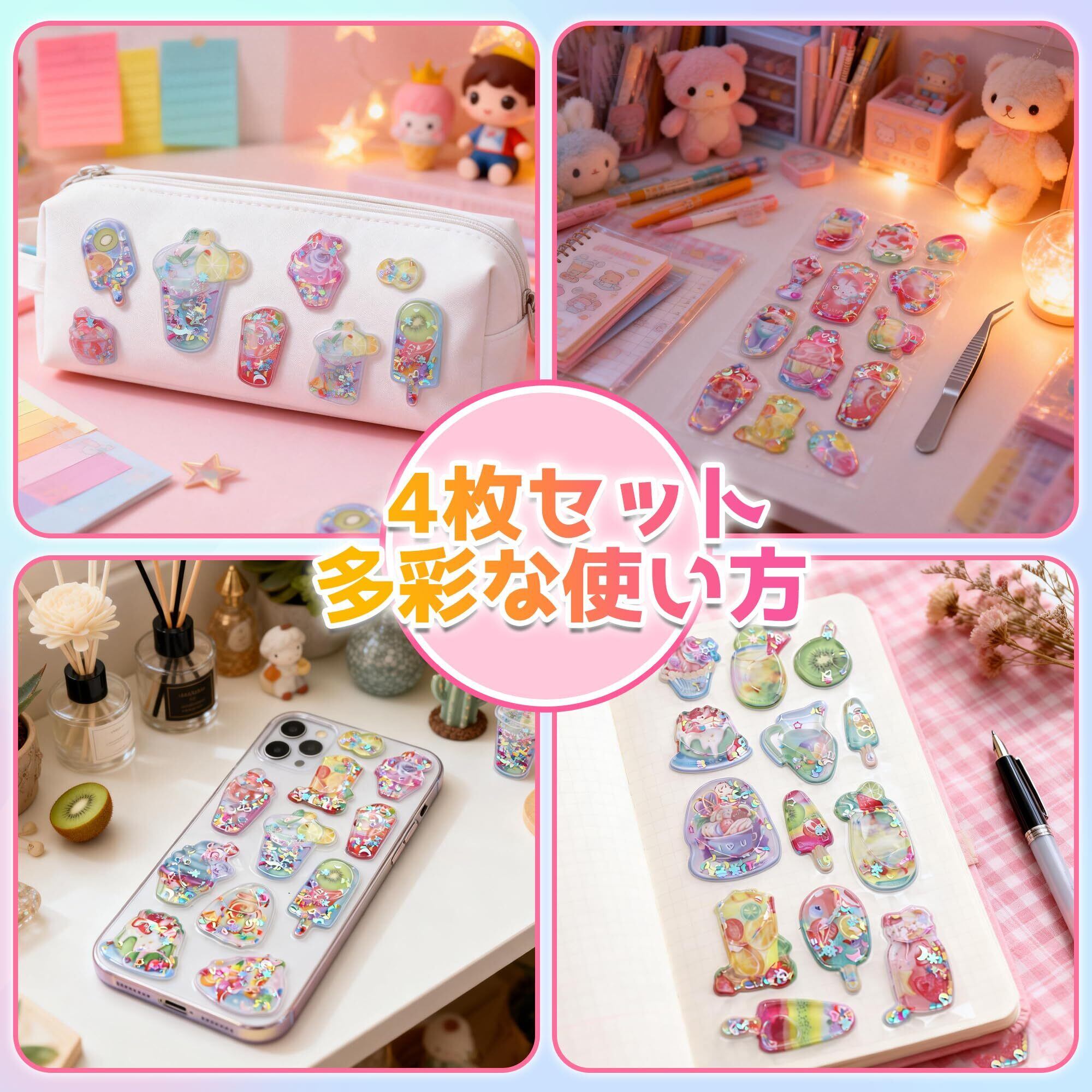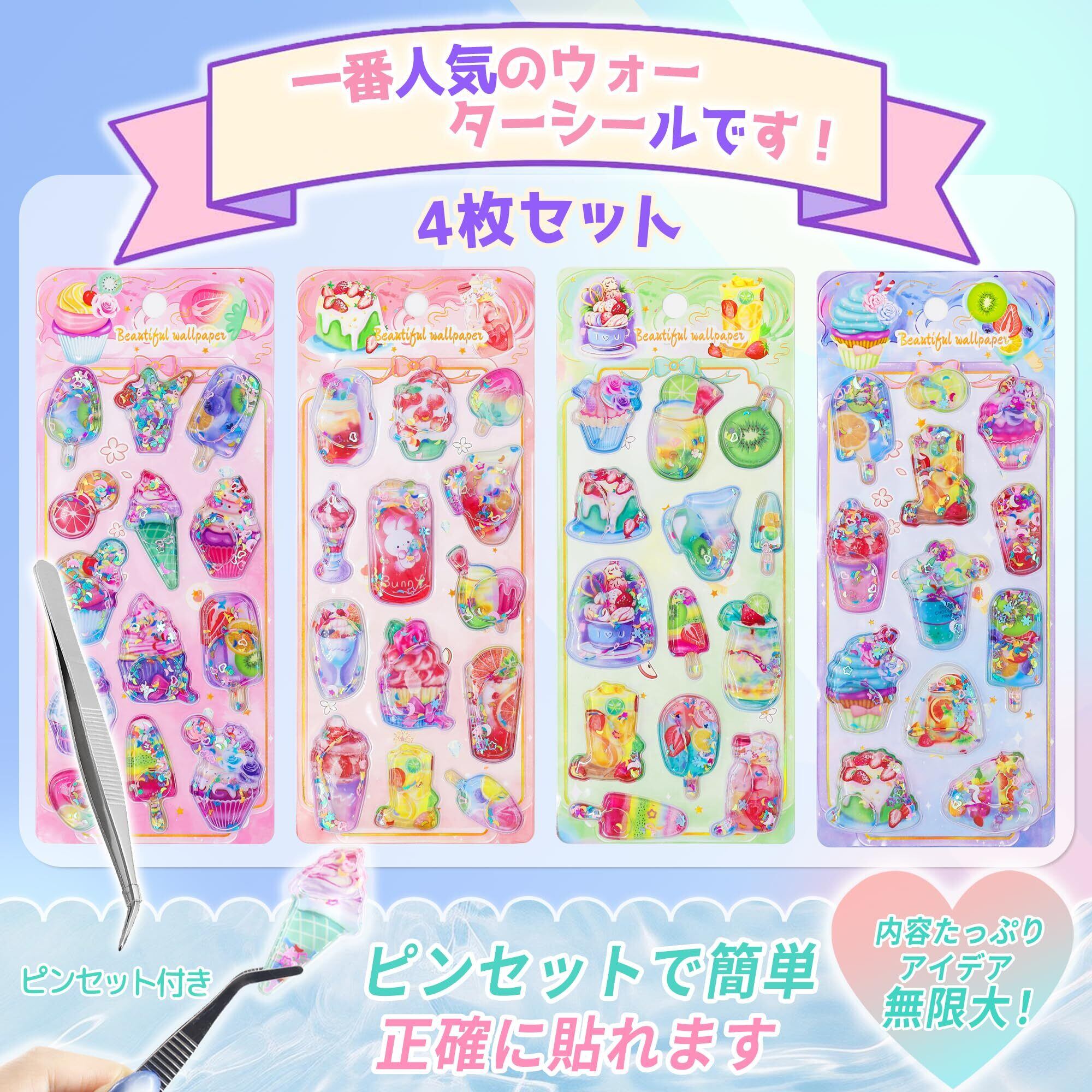 【新発売!夢のようなウォーターシール】新発売の3dシール(立体ウォーターシール)は、ぷっくりとしたデザインにキラキラのラメと透明感のある水シールを封入。手帳デコレーションに最適な、ウォーターシール 可愛いアイテムです。付属の専用ピンセットで貼り位置の微調整が簡単。繰り返し貼り直してもシールが汚れたり指紋が付かず、常に清潔に保てます。デコレーション初心者から上級者まで、より楽しく快適な創作体験を提供するかわいい シールセットです。色:4枚セット-スイーツ柄。