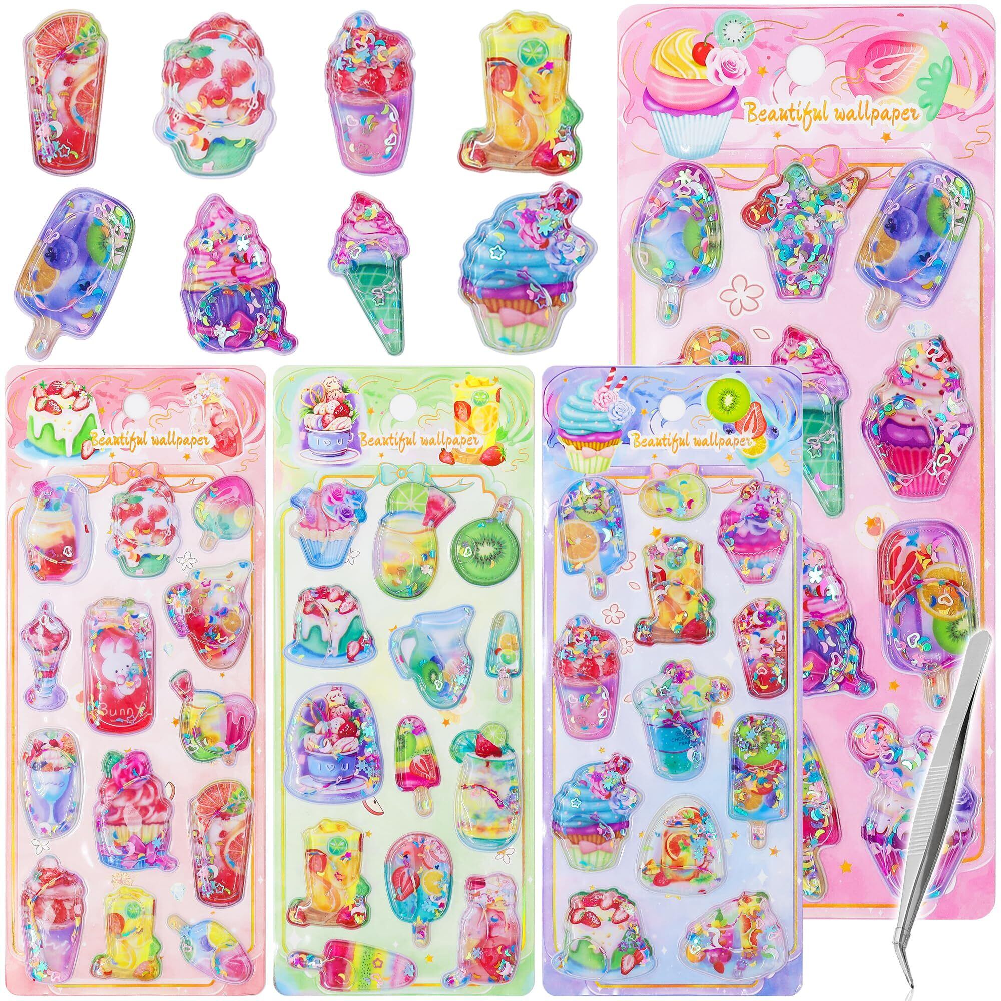 ウォーターシール 水入りシール ぷくぷく 3D 立体【4枚セット+ピンセット付き】スパンコール入り キラキラ 浮き出し 可愛い カラフル 手帳用装飾 日記帳用 携帯電話飾 DIY クラフト 女の子 誕生日プレゼント 贈り物 手芸用品 デコシール 貼り付け可能(4枚セット-スイーツ柄)