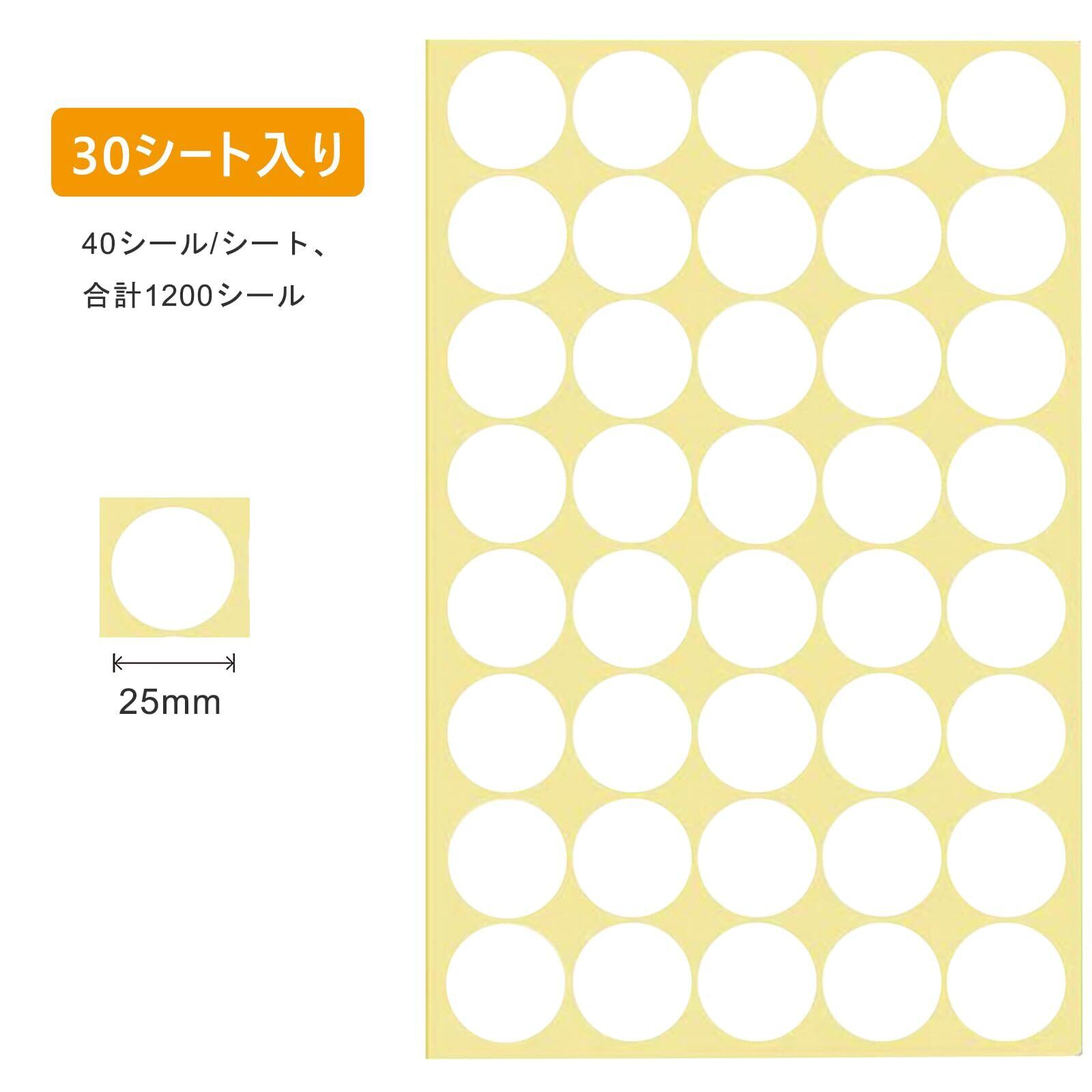 カラーラベル 白 丸型 25 mm 30シート 1200片入り 丸シール 円形 ステッカー ラベルシール 事務用品 オフィス用 単色 ホワイト 2.5 センチ