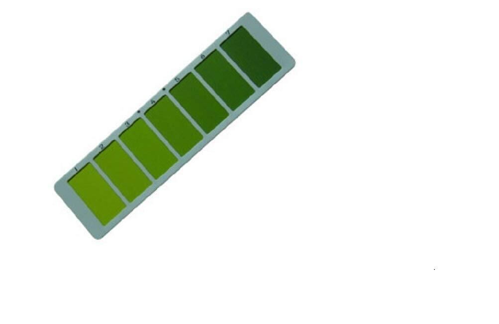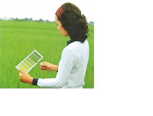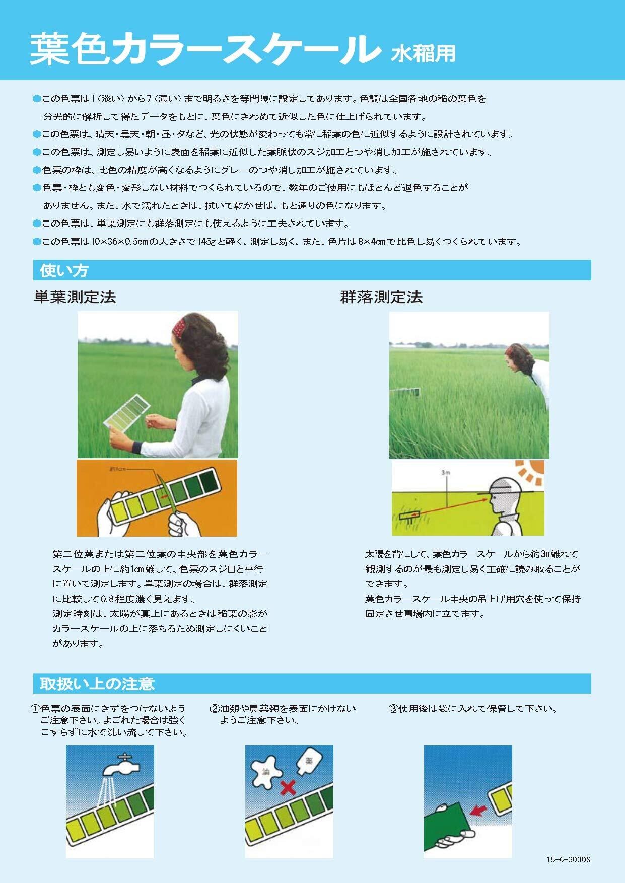 ●色票は1(淡い)から7(濃い)まで明るさを等間隔に設定してあります。色調は全国各地の稲の葉色を分光的に解析して得たデータをもとに、葉色にきわめて近似した色に仕上げられています。 ●色票は、晴天・雲天・朝・昼・夕など、光の状態が変わっても常に稲葉の色に近似するように設計されています。 ●色票は、測定し易いように表面を稲葉に近似した葉脈状のスジ加工とつや消し加工が施されています。 ●色票の枠は、比色の精度が高くなるようにグレーのつや消し加工が施されています。 ●色票・枠とも変色・変形しない材料でつくられているので、数年のご使用にもほどんど退色することがありません。また、水で濡れたときh、拭いて乾かせば元通りの色になります。 ●色票は、単葉測定にも群落測定にも使えるように工夫されています。 ●色票は10×36×0.5㎝の大きさで145gと軽く、測定し易く、色片は8×4㎝で比色し易くつくられています。