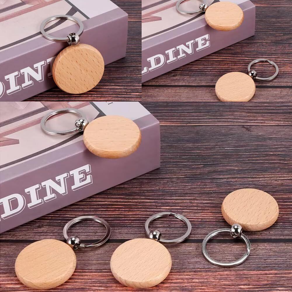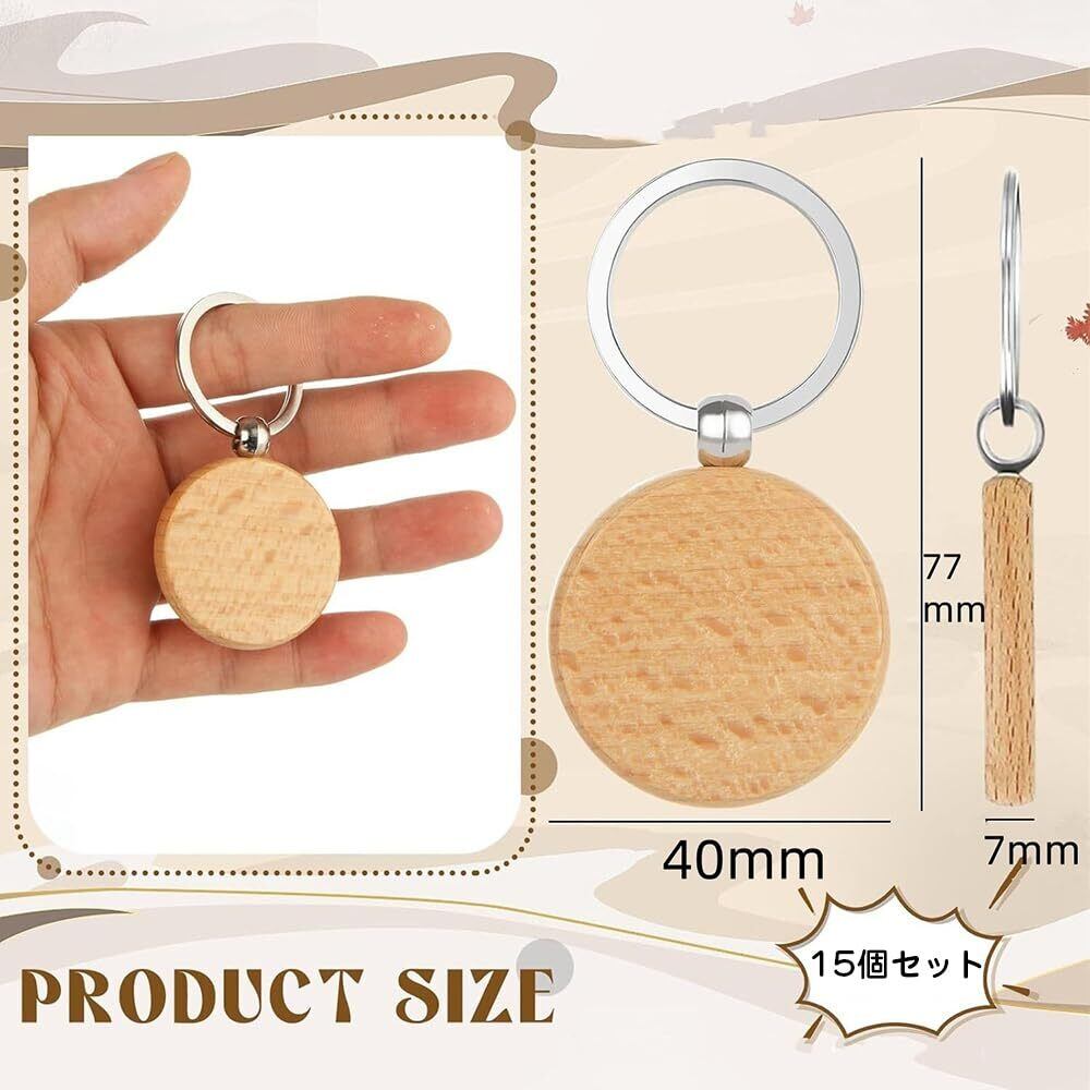 【製品仕様】木製キーホルダー*15個、直径4cm、厚さ0.7cm。