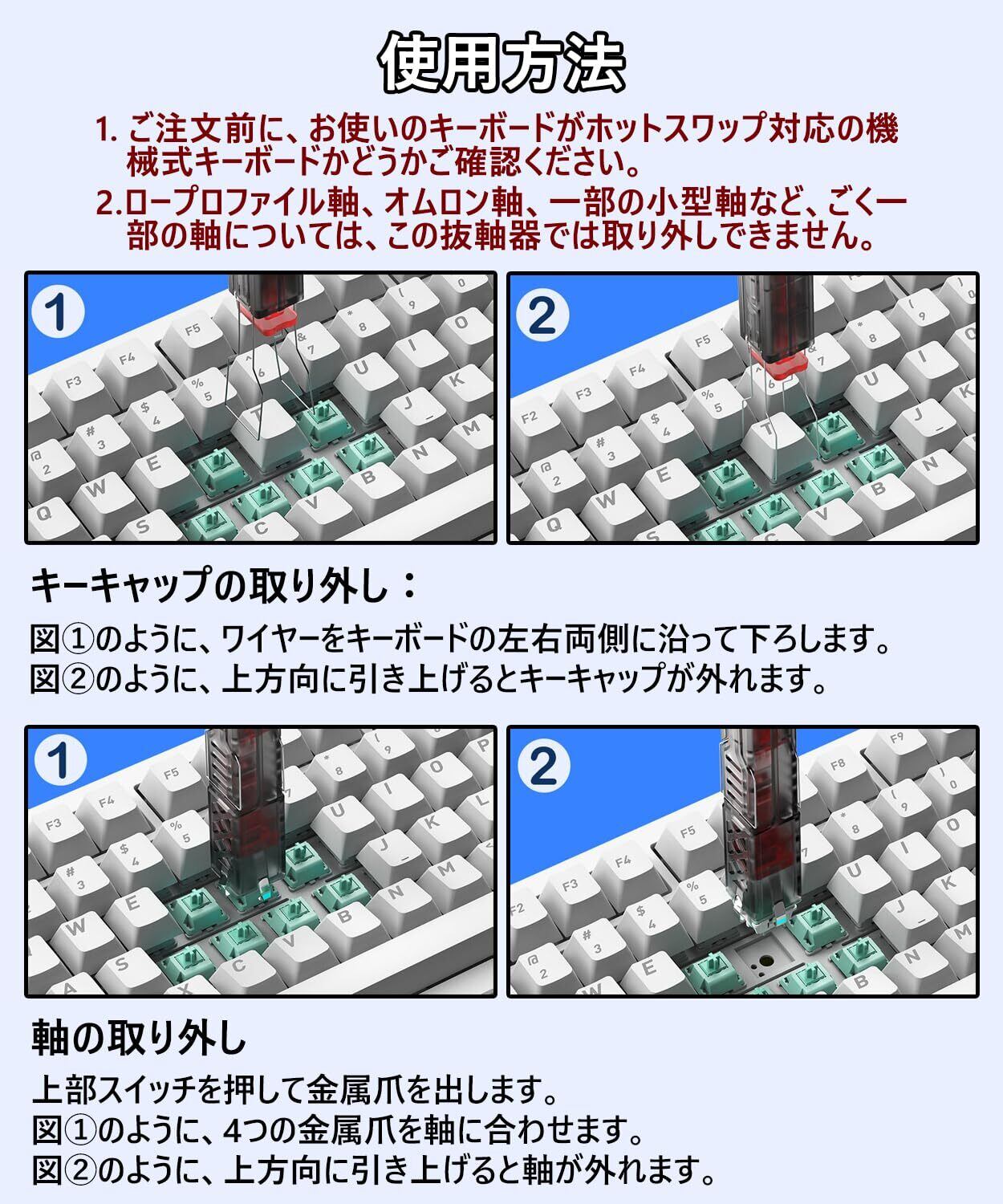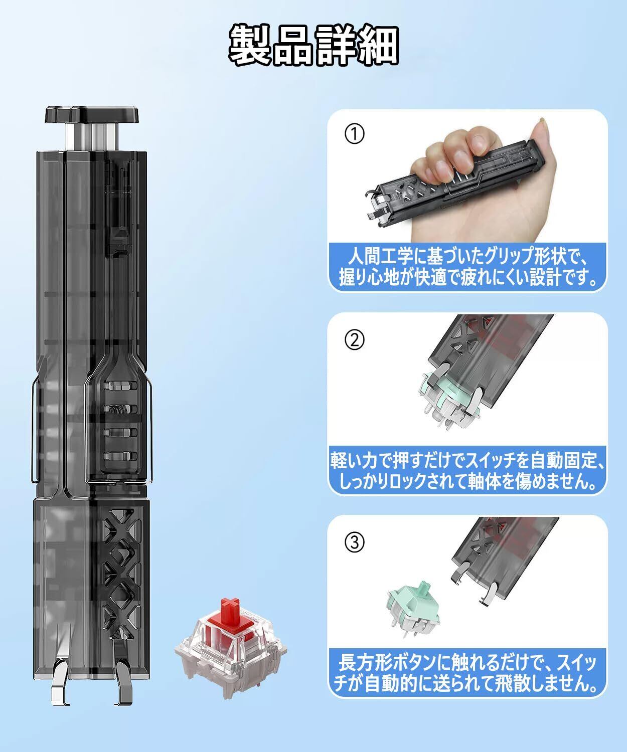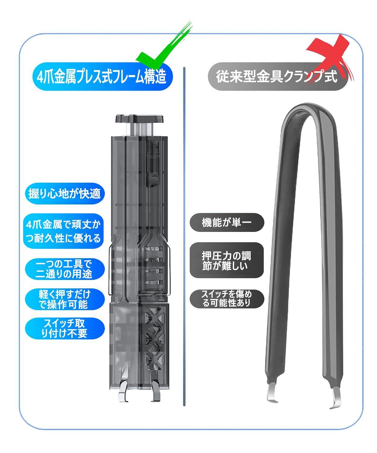 【4爪デュアルモード精密把持システム】ステンレス製4爪底部把持構造を採用し、キーキャップ引き抜きとスイッチ軸外しの両方に対応。爪部が安定した把持力を提供し、1.2mm厚肉設計でキーキャップの滑り・損傷を防止。