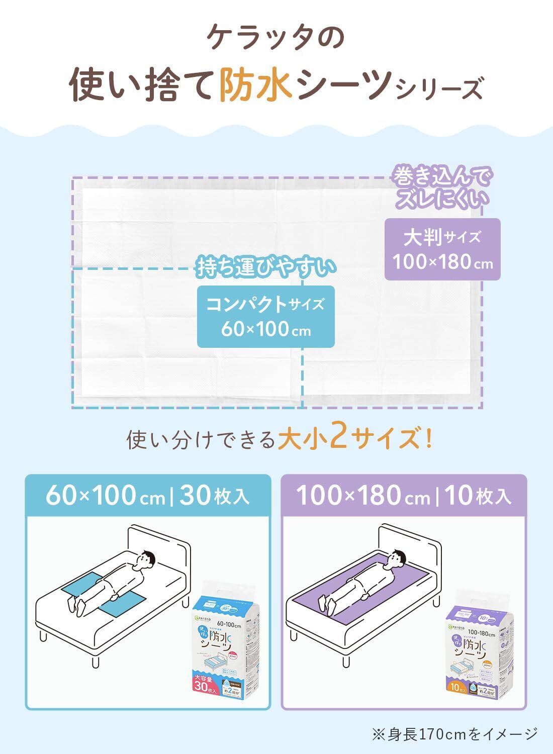 【選べる2サイズ】[60×100cm 30枚入り]は横幅がシングルベッドにちょうどいい100cm。腰やお尻の下などの気になる部分をポイントカバーできるコンパクトタイプです。毎日使える嬉しい大容量![100×180cm 10枚入り]はマットレスや敷布団に巻き込みやすくズレにくい超大判なロングサイズ。シングルベッドに対して縦置きすれば広範囲をカバーできます。ご自宅、旅先、病院で、シーンにあわせて使い分けできます。