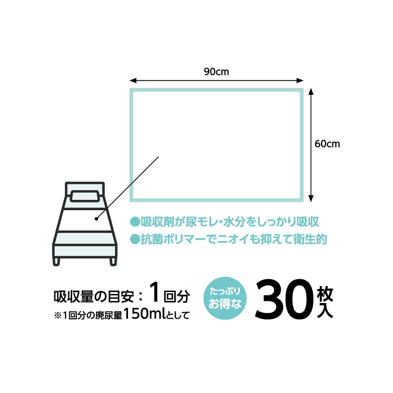 【多機能おむつシート】防水シートとしてだけでなく、おむつ替えシートやベッド時のお掃除シートとしても使えます。ワイドサイズ 60cm×90cm 30枚入りでお得です。大きめサイズなのでベッドや洗い替えに幅広く使えます。介護用やおむつシートとしても最適です。