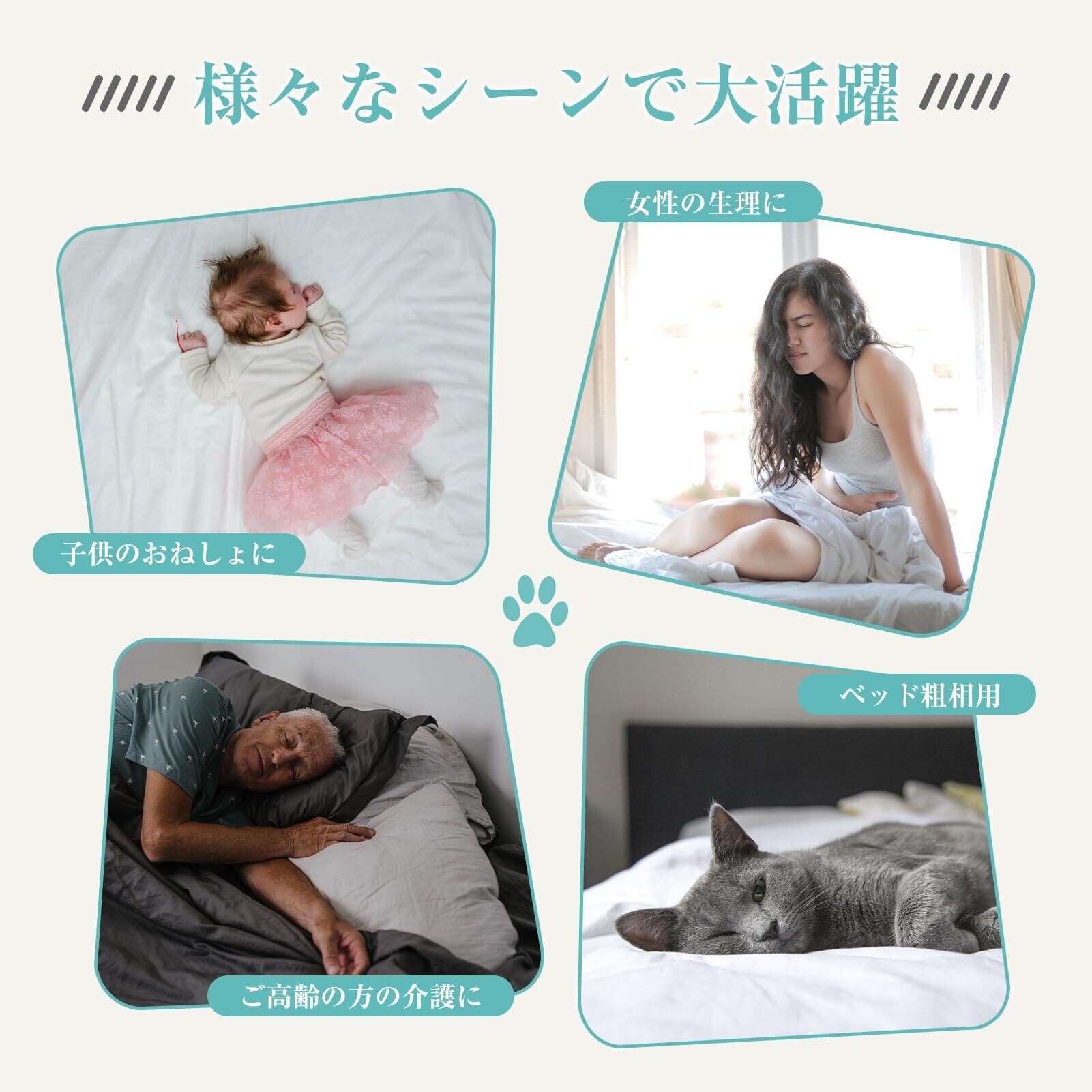 【多用途・防水シート】お子様おねしょシーツとしてはもちろん、ご病人・ご老人の介護用品やペット用としても幅広くお使いいただけます。お布団やベッドだけでなくソファーなどでも日常使いに防水シーツをご利用されている方も増えています!また小さく畳めるので持ち運びも楽ちん!旅行先でも安心して眠れます。