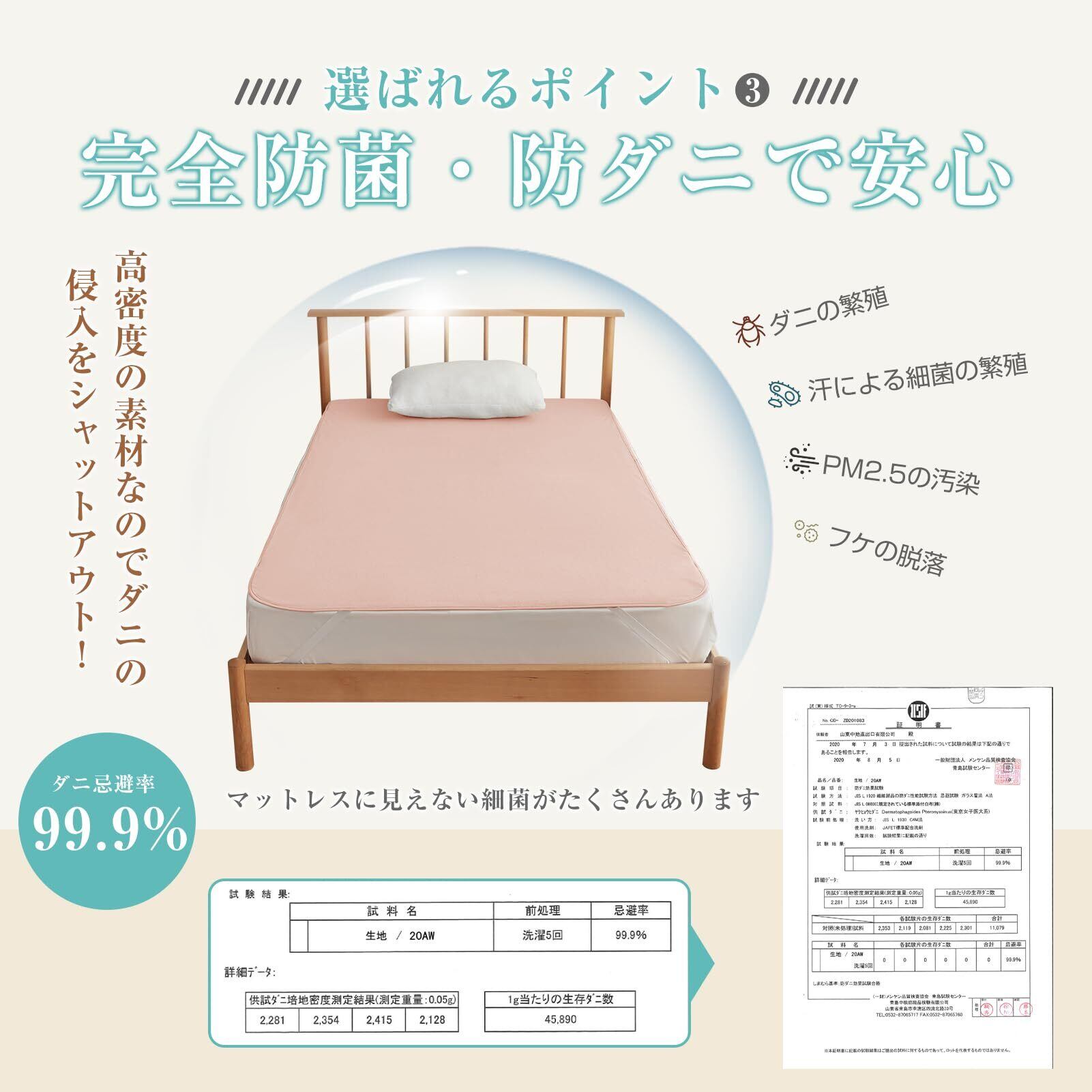 【お体に優しいダブル抗菌!】パイル地の基布と防水面は高密度素材を使用、細菌の繁殖を自然に抑えて、ダニの侵入もシャットアウトします。抗菌防臭効果には、SEKマークを取得し、清潔さにご安心できます。