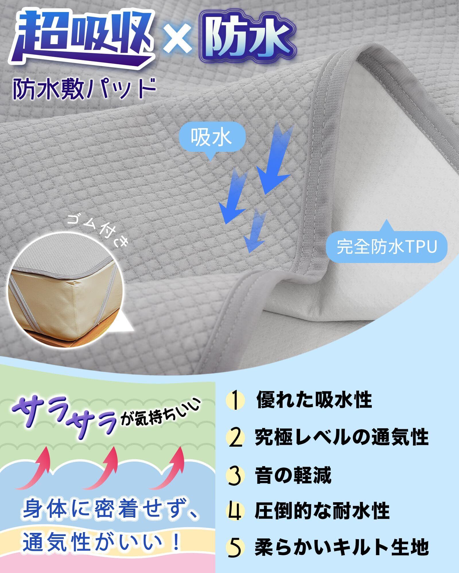【超吸水機能付き・防水シーツ シングル】通常の防水シーツは薄すぎで、使用上に吸水性が低くく、水を垂らしてキャッチできずに広がります。この点を基づき、厚さに専念し、厚めで吸水機能付きのおねしょシーツを開発しました。表生地に吸水機能が優れた多層素材を採用し、裏面に複合材料の防水性が優良であるTPU防水フィルムを使用しました。そのため、通気性、防水機能及び吸水性、三つの特徴を兼ね備え、快適にご使用いただける介護用防水シーツを実現しました。裏面のポリウレタンコーティングが水分をしっかりガードして、シーツを濡らさずに毎朝ストレスフリー。下に敷いている寝具に水分をこぼさないので、心配なく隣で添い寝することができます。