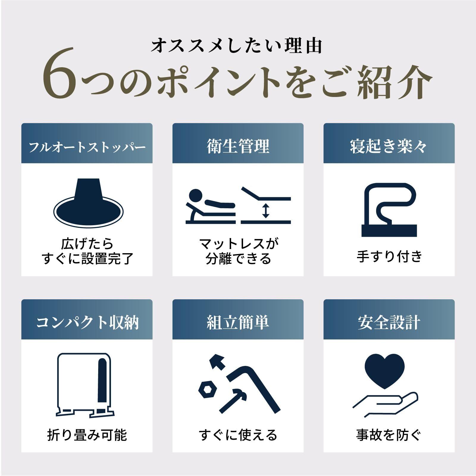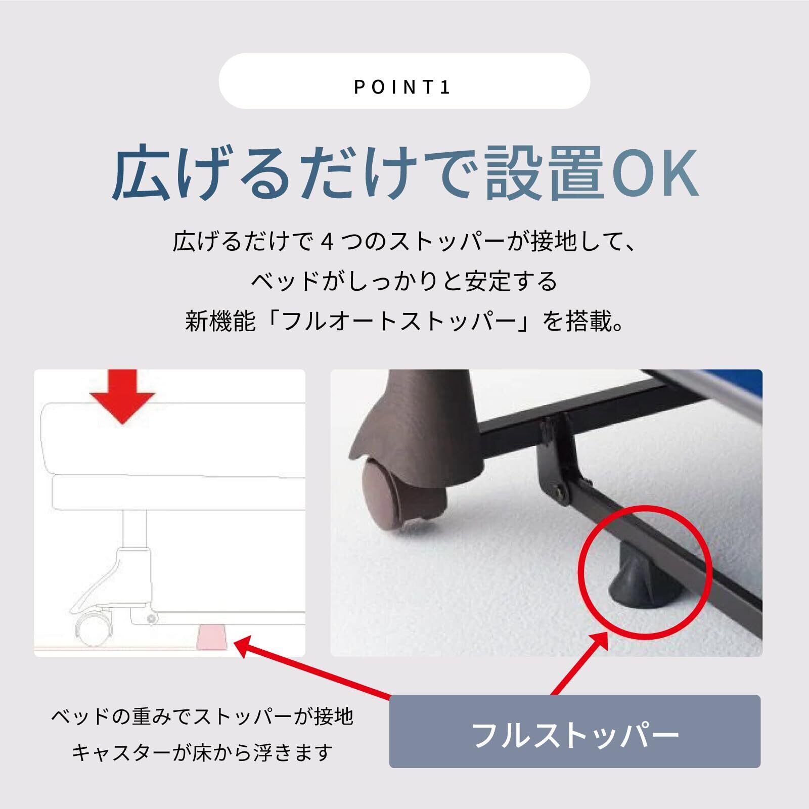 本体を広げると4つのストッパーが接地してベッドがしっかりと安定する新機能「フルオートストッパー」を搭載。ベッドが不意に移動することを防ぎ、面倒なキャスター受け皿の設置やストッパーの上げ下げ作業をなくしました。
