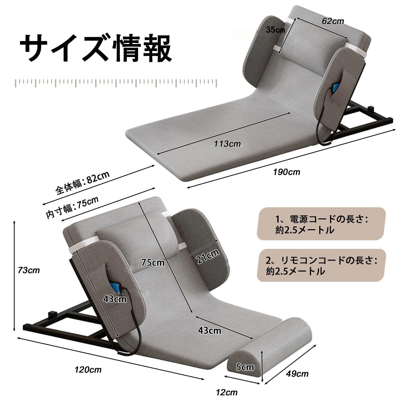 【2°~80°の無段階角度調整】電動背もたれ ンで制御できるこの背もたれは、角度を2°から80°まで簡単に調整でき、確実な操作が可能です。