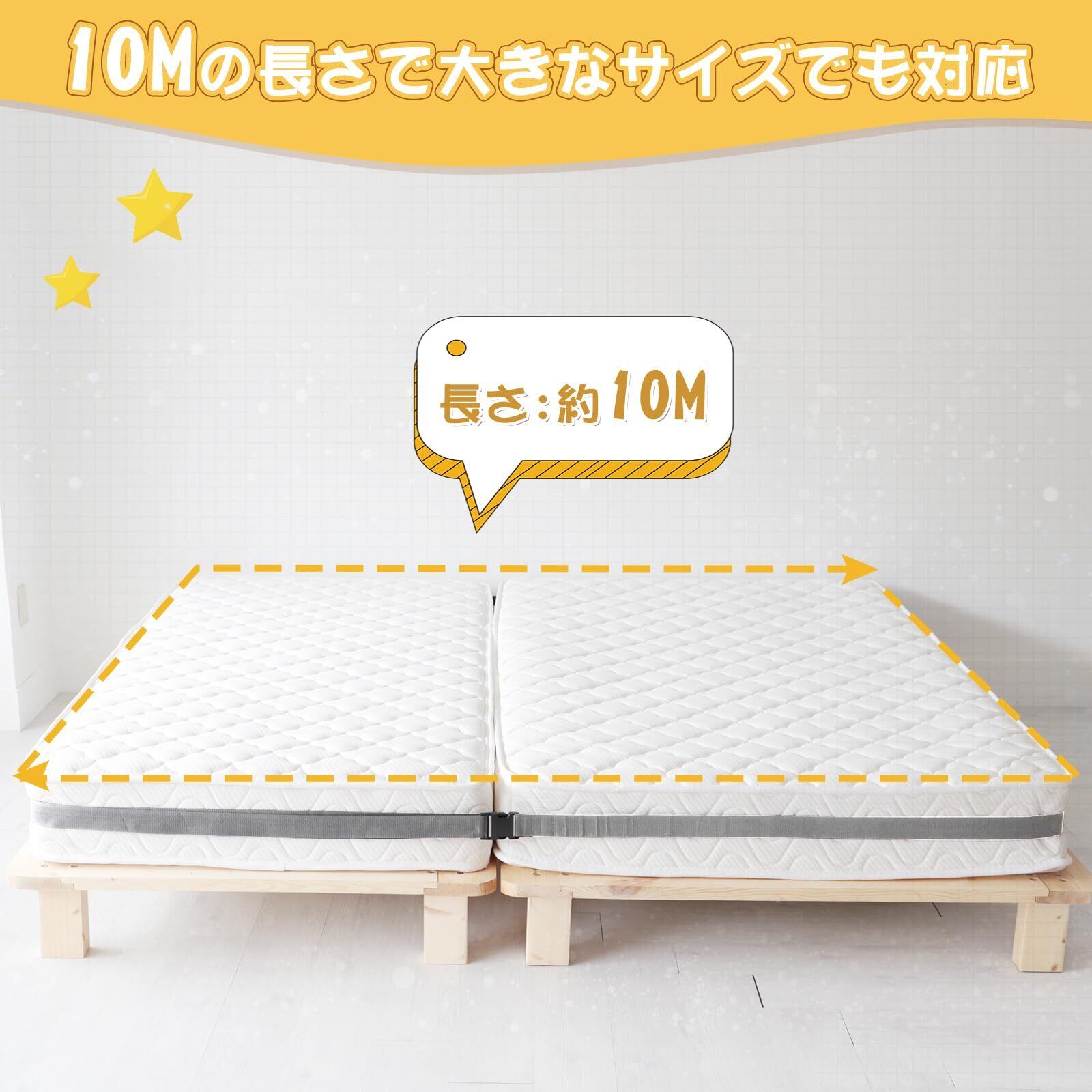 【商品仕様】サイズ:幅5cm × 長さ1000cm × 厚さ約1mm。カラー:ホワイト、グレー、ブラック。【超ロングサイズ対応マットレス用バンド】最小5mから最大10mまでの幅広いマットレスを対応。シングル、ダブルサイズのマットレス2枚にも対応。幅広いマットレス連結が可能で、大家族でも安心です。【ご注意】本品は、「マットレス厚10cm以下の薄いマットレス」、「手で簡単に折れる柔らかいマットレス」、「折りたたみマットレス」、「ウレタンで芯のないマットレス」ではご利用いただけません。