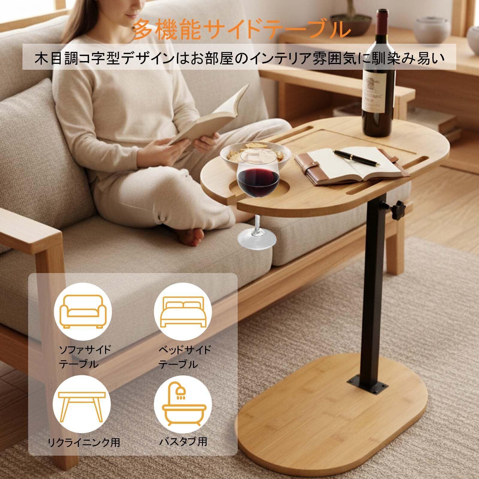 【多機能昇降式サイドテーブル】このシンプルなサイドテーブルは、頑丈なスチールフレームと高密度竹板で作られており、優れた耐荷重性と安定性を備えています。テーブルには5つの異なる収納スペースがあり、仕事用のタブレット、ノートパソコン、ペンを置くことも、レジャー用のスナックやワインなどを置くこともできます。耐熱性も高く、バスルーム用サイドテーブルとしてバス用品などを置くことも可能です。日常生活で幅広く活用できる、実用性の高い多機能リフトテーブルです。