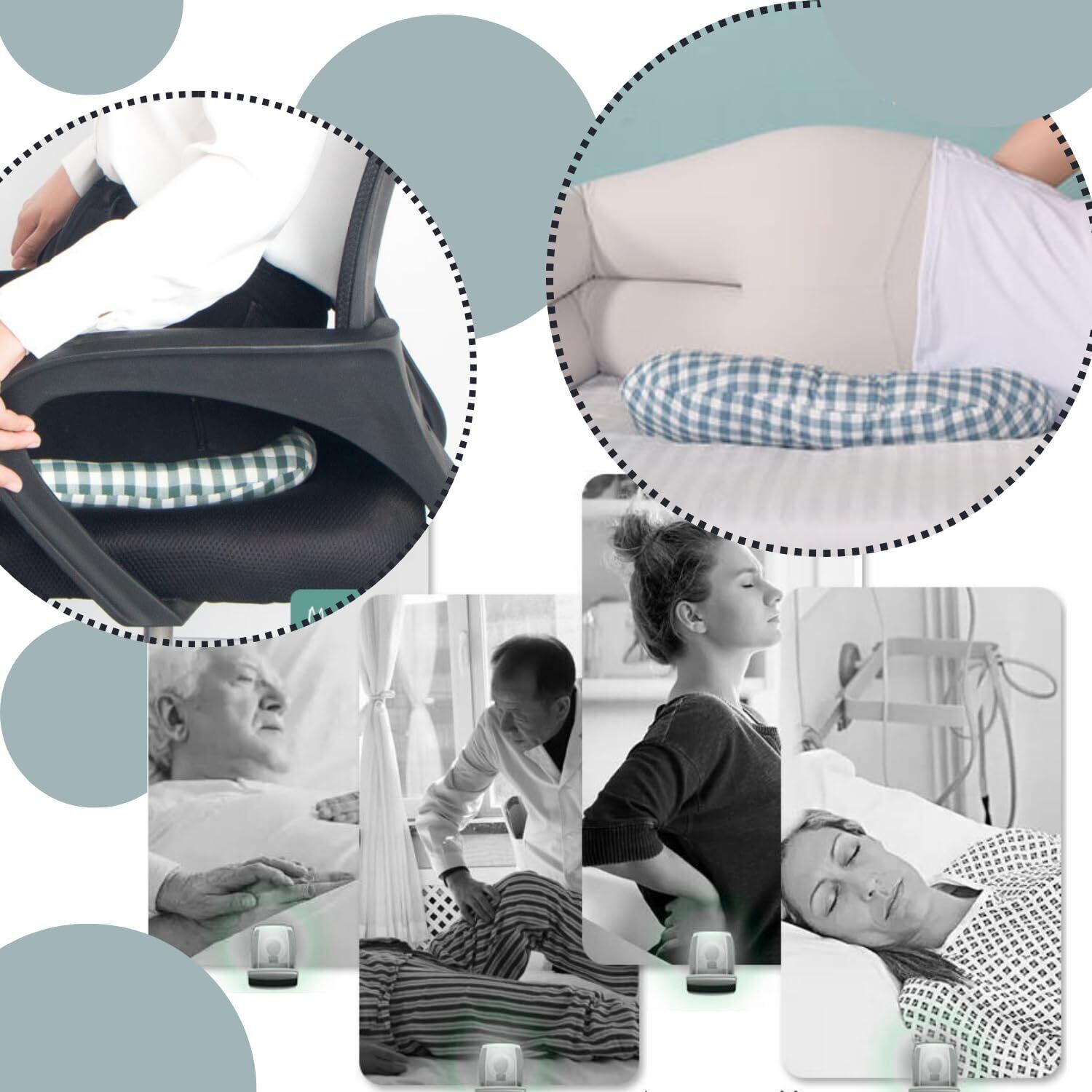 【床ずれの緩和に】治りにくい床ずれを緩和するクッション。寝たきりなどにより圧迫されている箇所の血流が悪くなり発生する褥瘡の予防・緩和に役立ちます。四角い枕の中央には円形の開口部がありお尻に敷くことで仙骨の痛みを和らげる他、頭部や腰など身体のあらゆる部位の痛み緩和のサポートをいたします