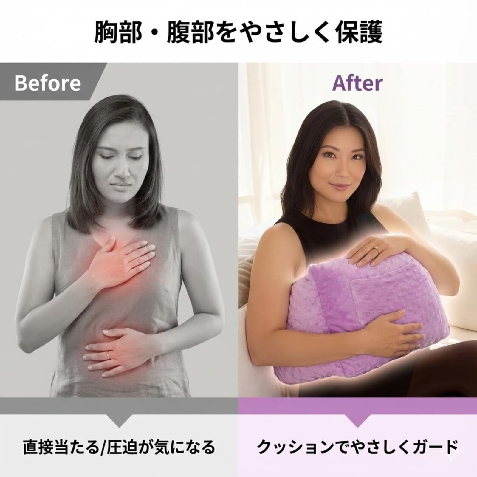 【不意の衝撃から患部を保護】胸部から腹部までを広範囲にカバー。咳、クシャミ、笑った時の振動や、就寝時の寝返りによる衝撃から手術痕を優しく守ります。抱き枕としても使用でき、術後のデリケートな時期に安心感を提供します。