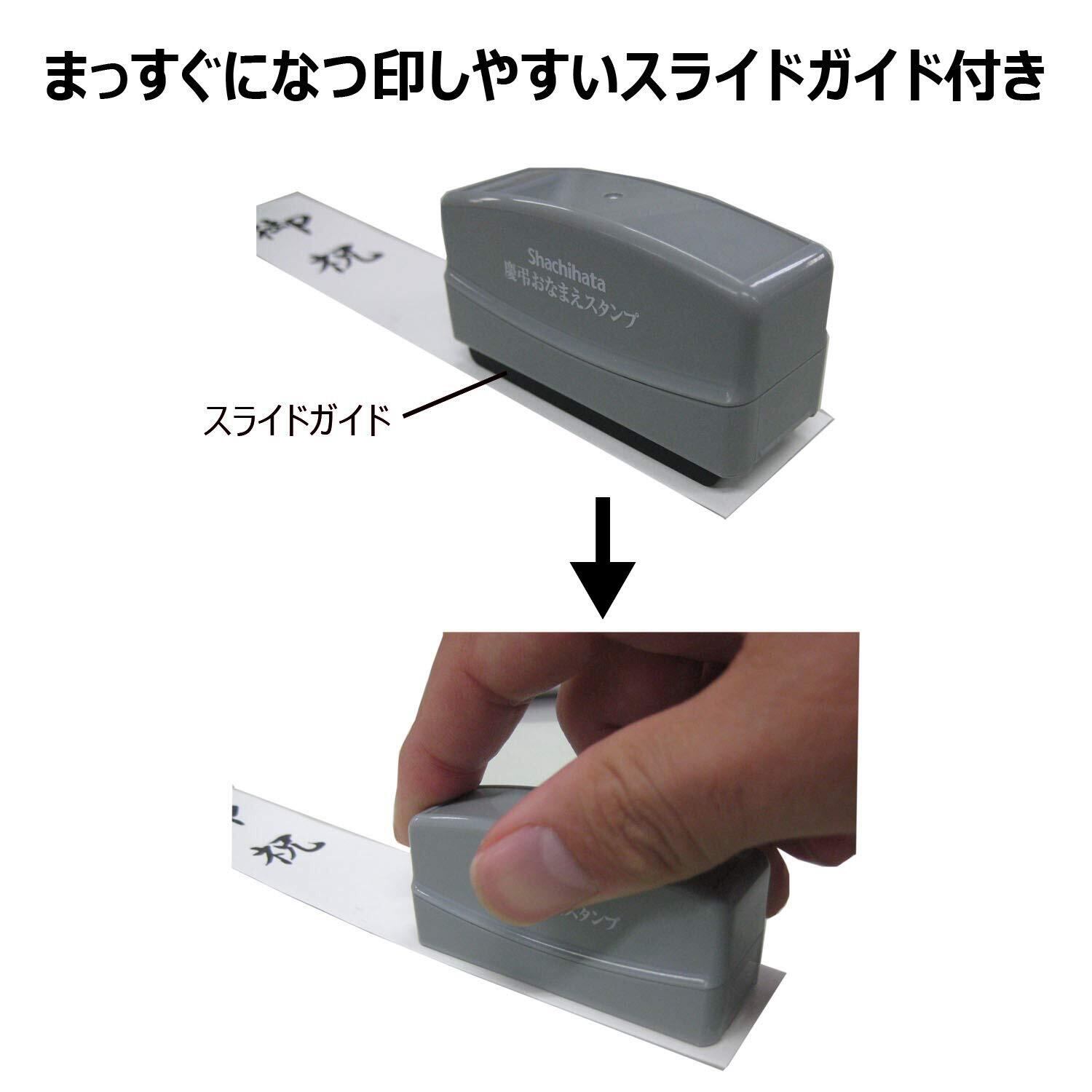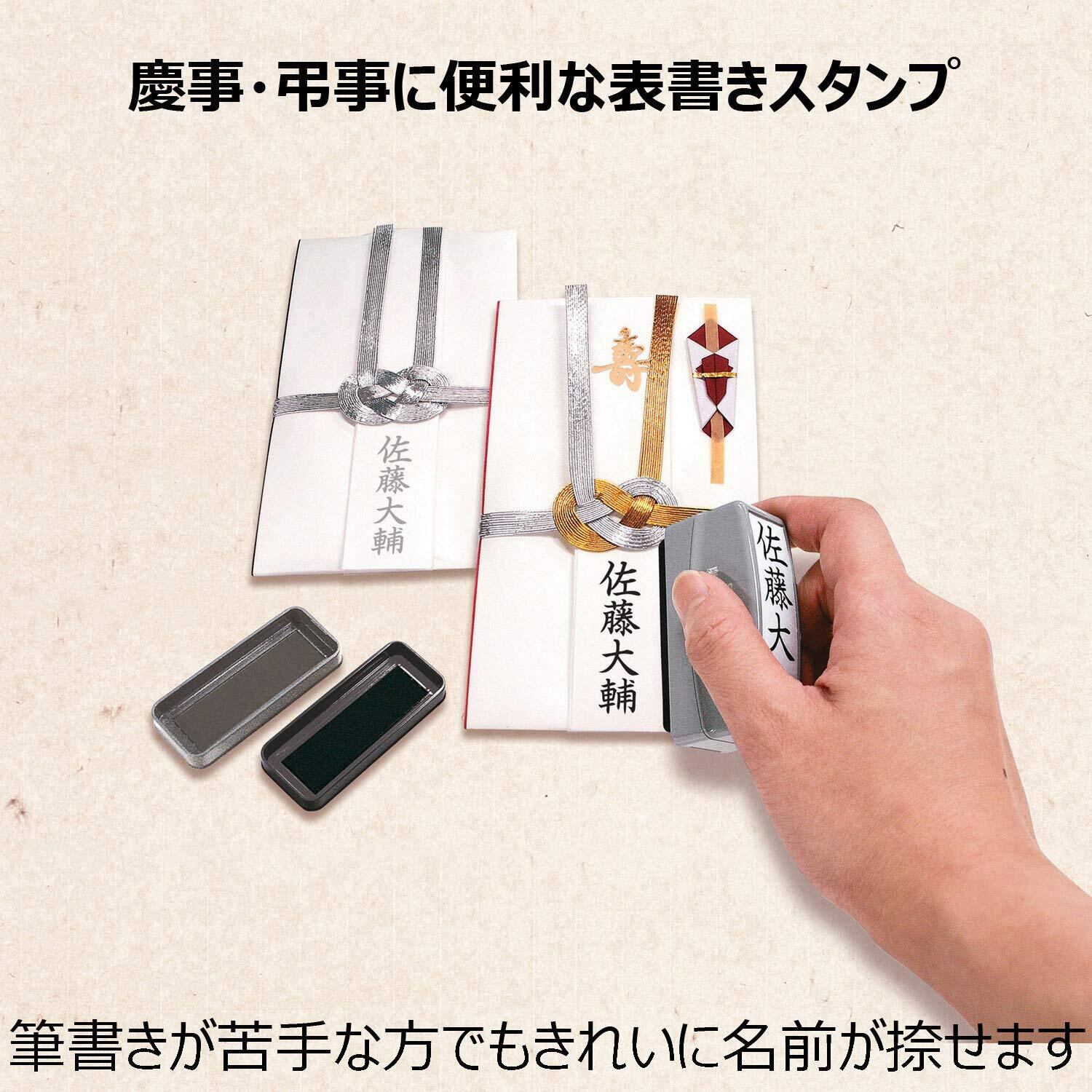 まっすぐなつ印しやすいスライドガイド付きで、ご祝儀やのし袋などへの表書きが、カンタン・キレイに出来ます。姓のみ、夫婦連名、社名入りなどのゴム印面も作れます。
