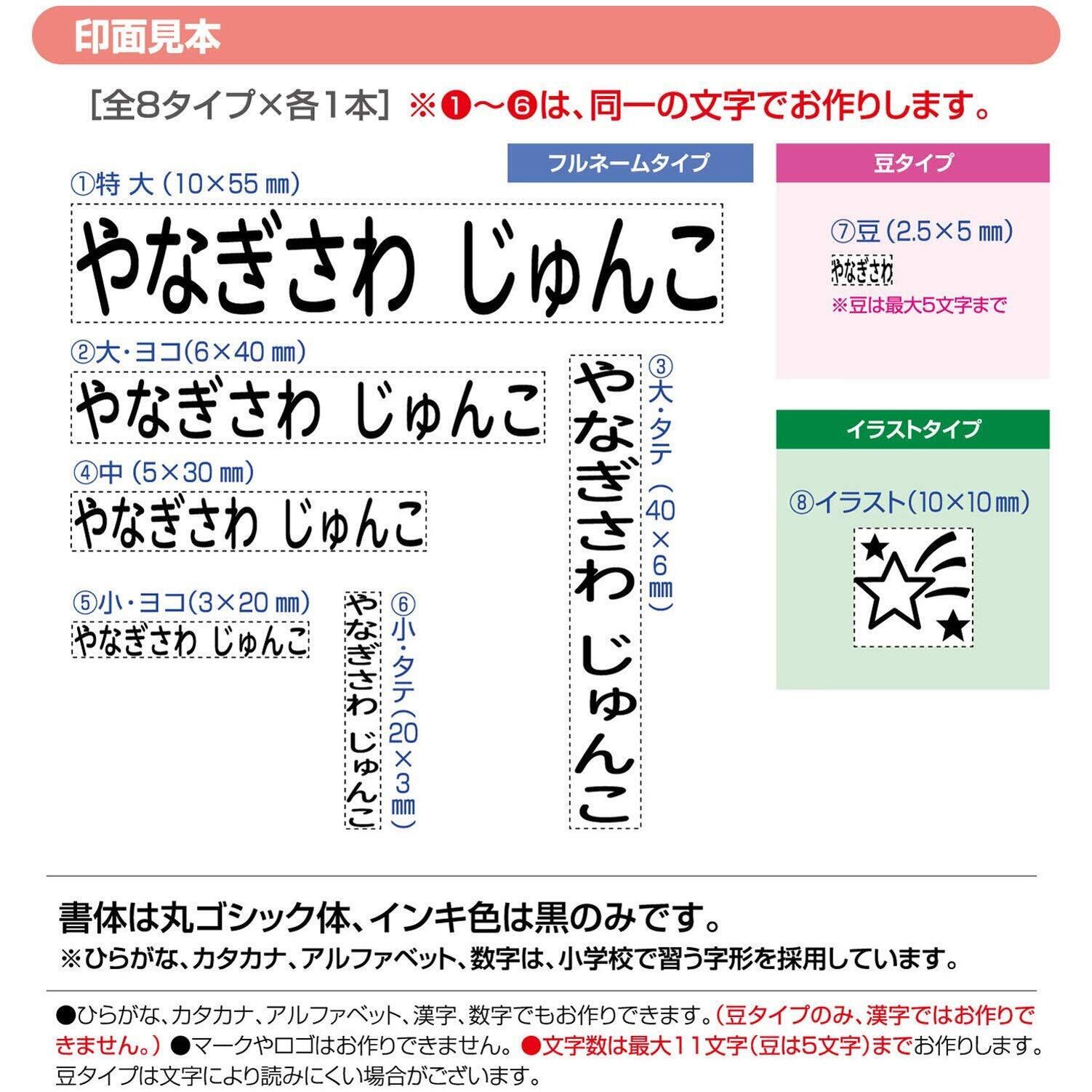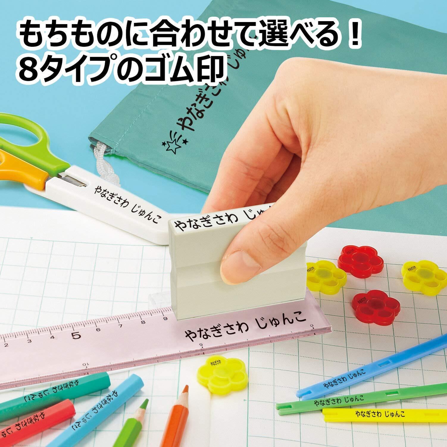 ・8タイプのゴム印(名前用:7タイプ・イラスト用1タイプ)がセットになっており、持ち物に手軽でキレイに名前やイラストをスタンプできます。