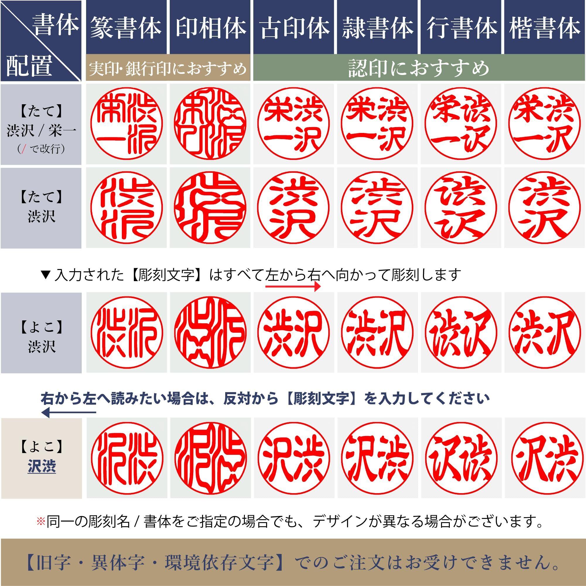 サイズや書体、配置について: 10.5 / 12 / 13.5 /15 /16.5 / 18mmの6サイズで展開。 実印や銀行印には15mm以上がオススメです。フルネームは13.5mm以上のサイズをご注文ください。 文字の配置についてはこだわりがなければスタッフにお任せいただくのがオススメです。