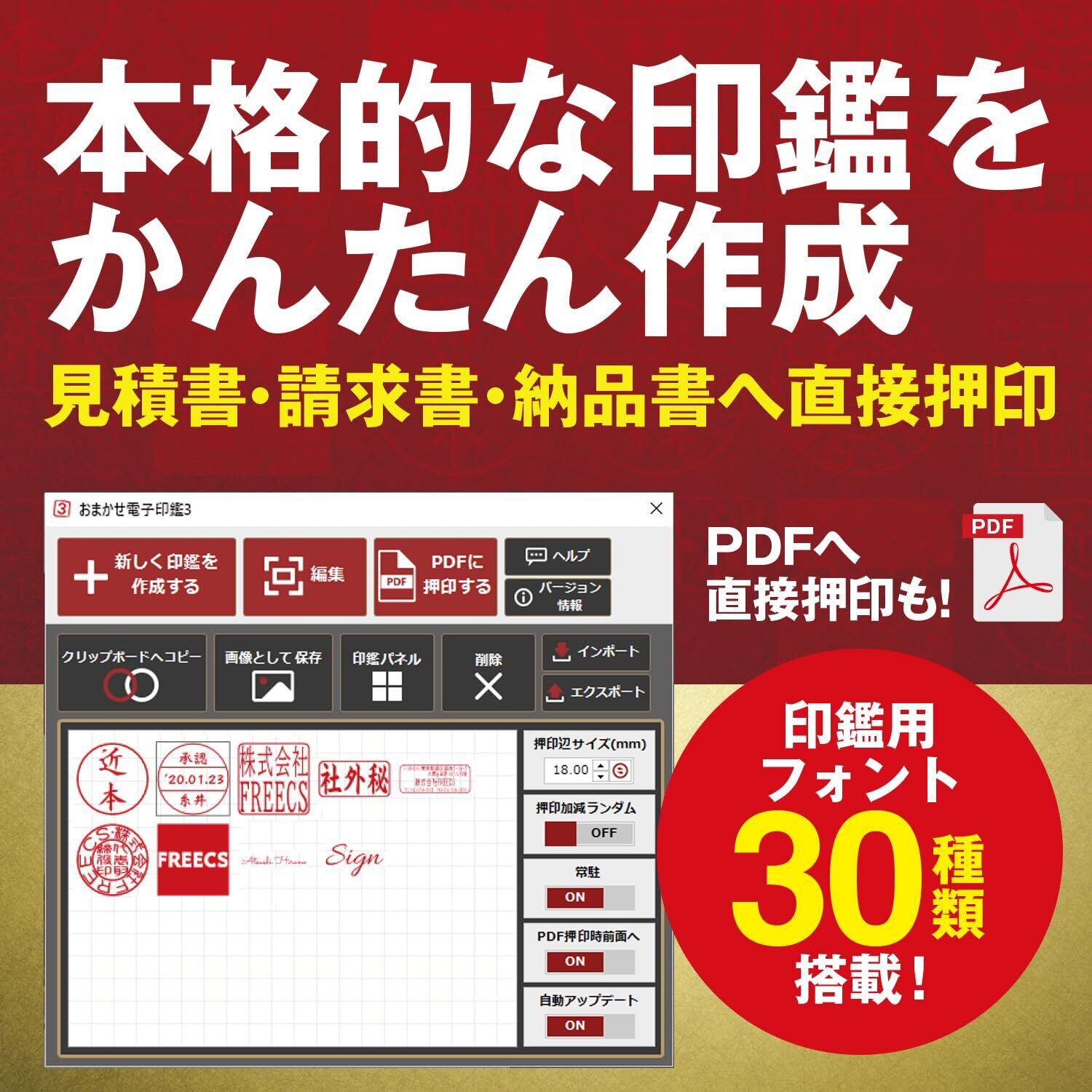 【PDFに直接押印】本ソフトで作成した電子印、電子印鑑は、ワード(Word)やエクセル(Excel)だけでなく、PDFにも直接押印することができる画期的なパソコンソフトウェアです。