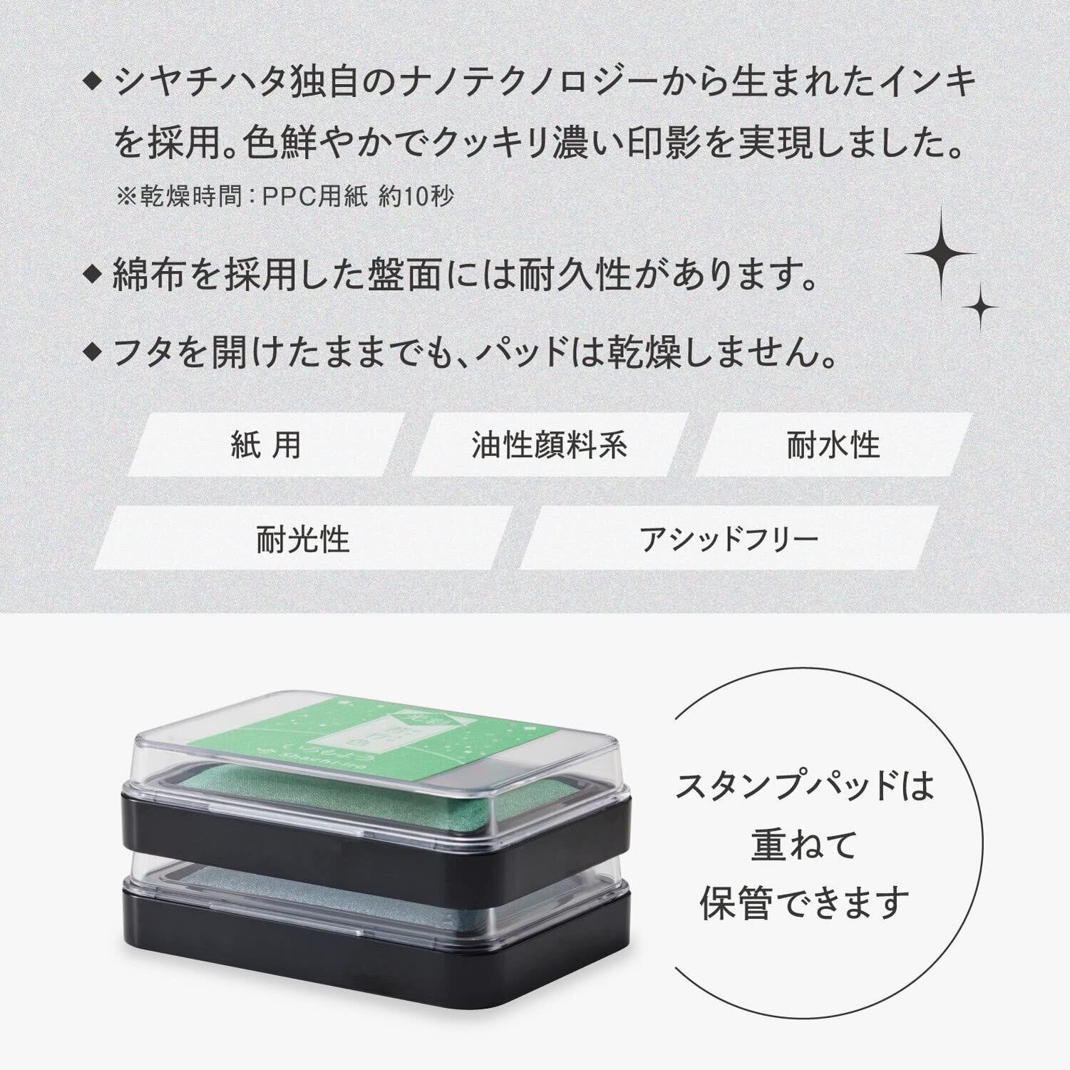 【特長1】シヤチハタ独自のナノテクノロジーから生まれたインキを採用。色鮮やかでクッキリ濃い印影を実現しました。※乾燥時間:PPC用紙 約10秒 【特長2】綿布を採用した盤面には耐久性があります。 【特長3】フタを開けたままでも、パッドは乾燥しません。