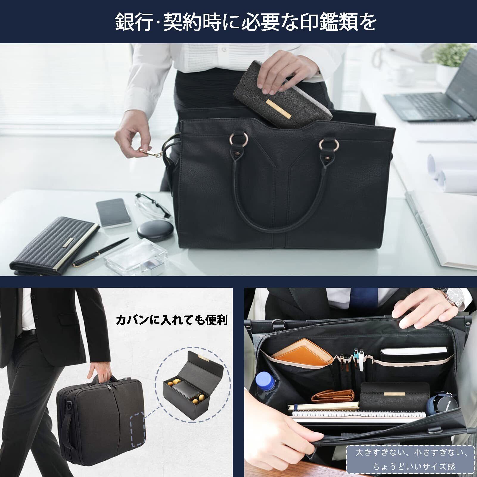 ■銀行・契約・商談などの外出先にも持ち運び出来る大きさなので、とても利便性の高い印鑑ケースとなっております。 小さい朱肉・スタンプ台・印鑑マットから印鑑カード、個人印鑑などもレイアウト次第では収納できます。