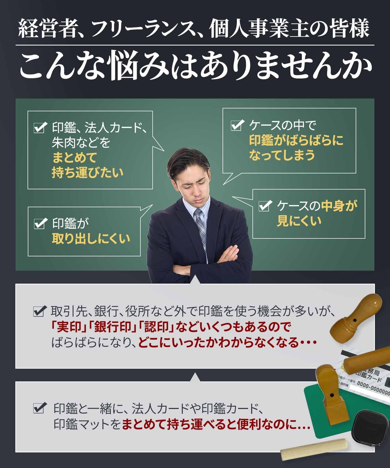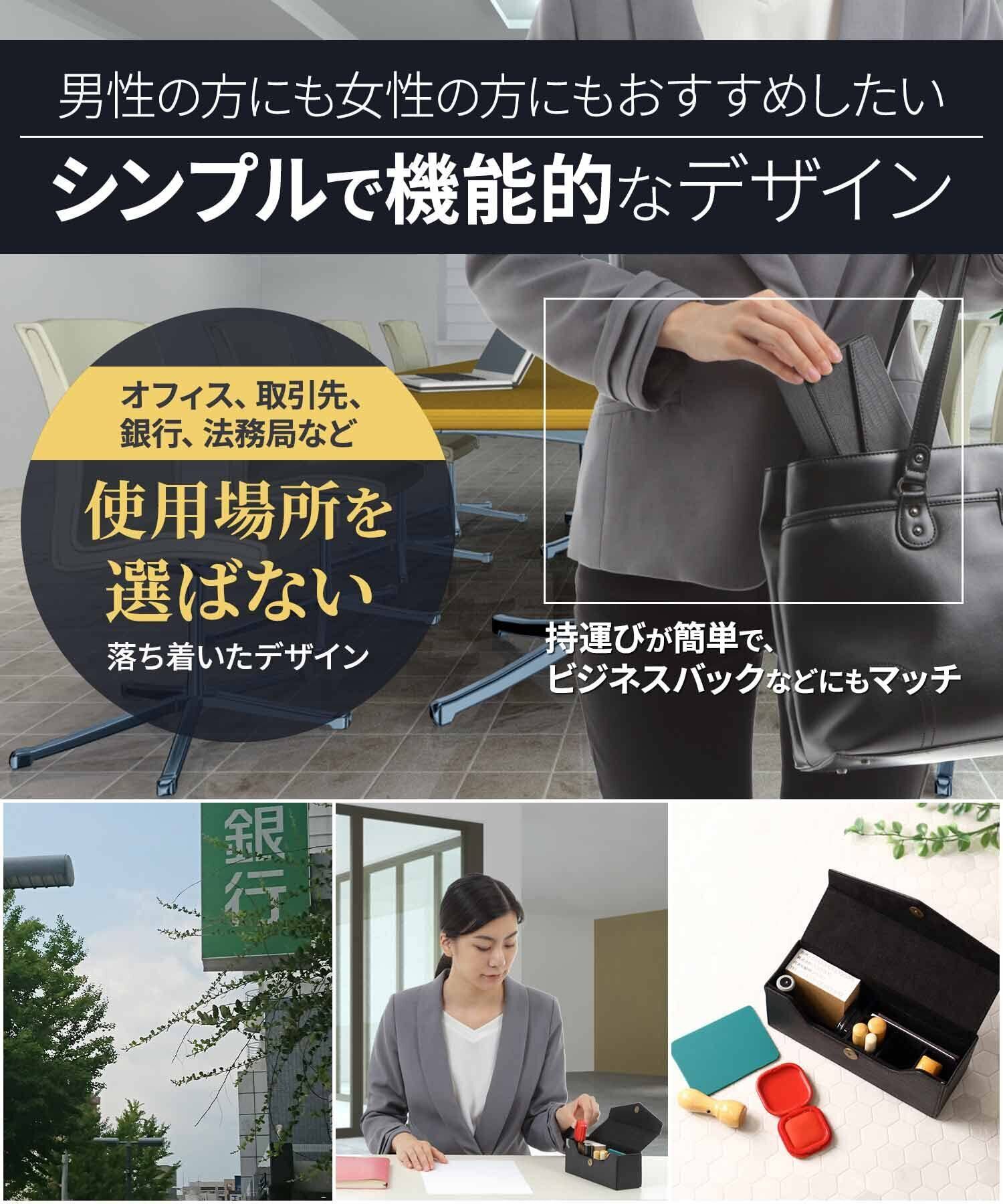 中身が見やすく印鑑が取り出しやすい形になっており、すぐに印鑑を取り出すことができます。 銀行・契約・商談などの外出先にも持ち運び出来る大きさなので、とても利便性の高い印鑑ケースとなっております。 印鑑だけでなく印鑑マット、朱肉、法人カード、印鑑カード、名刺などをまとめて収納可能でコンパクトに持ち運びいただけます。
