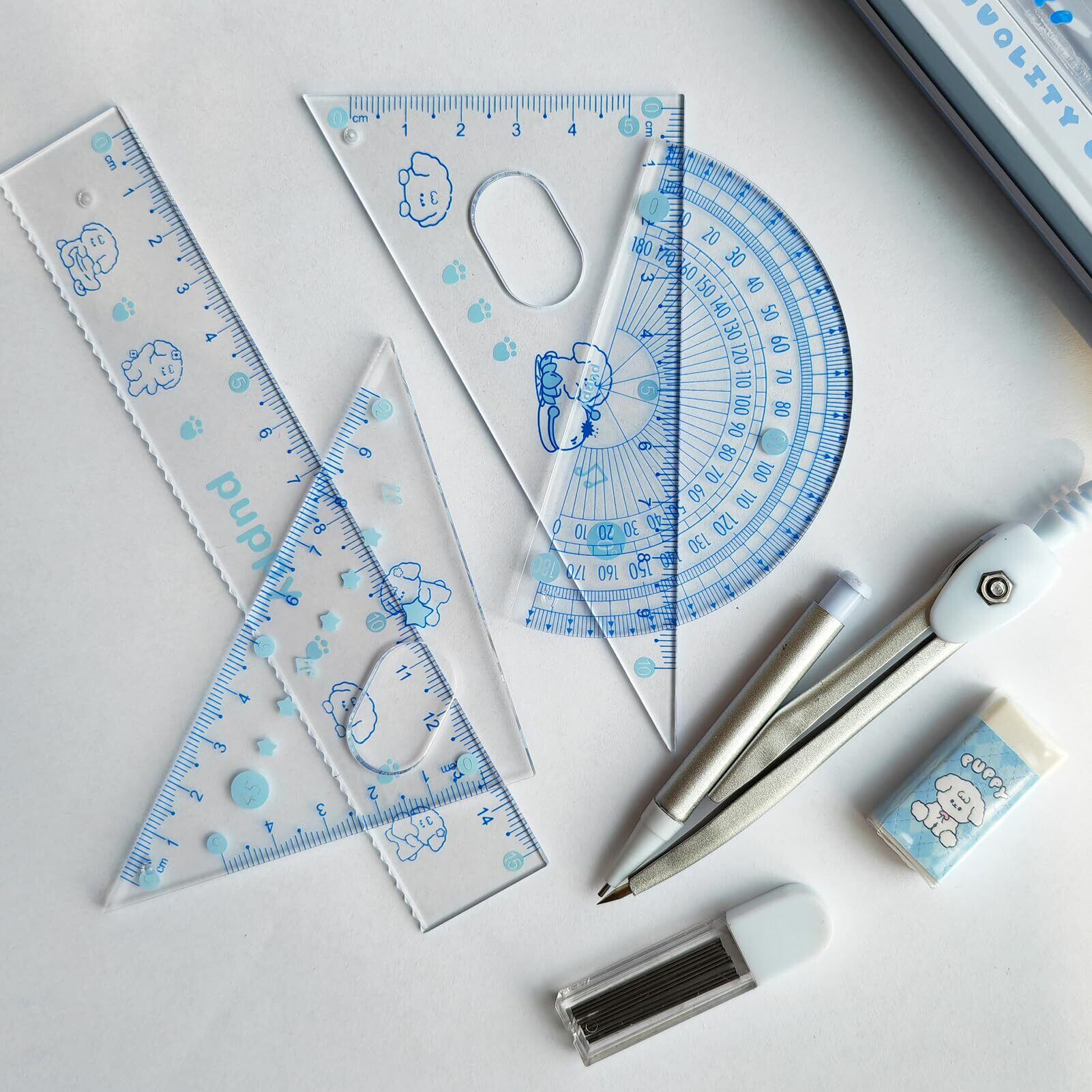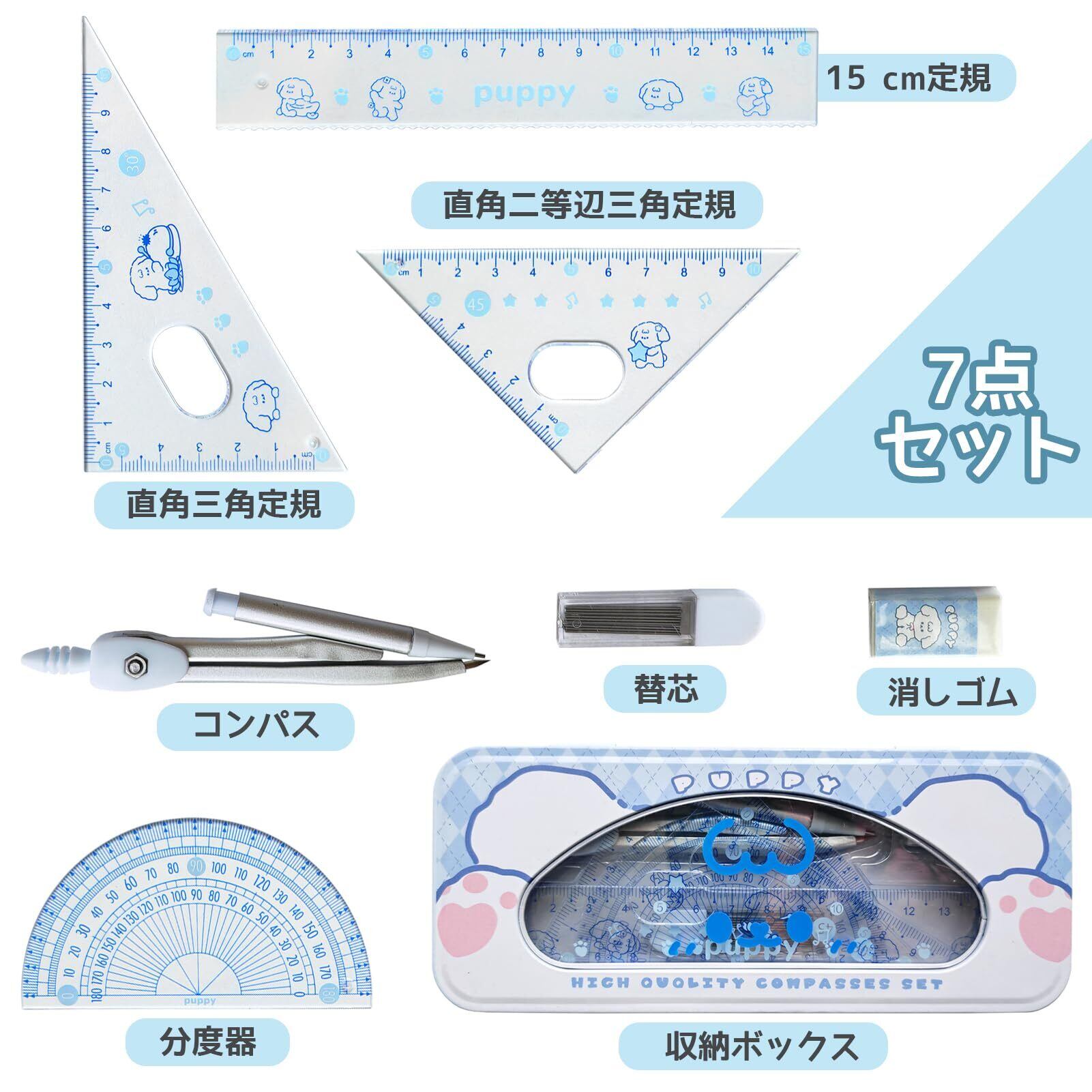 セット内容:(15cm)直定規*1個、(30°/60°)三角定規*1個、(45°)三角定規*1個、半円分度器*1個、コンパス*1個、(0.5mm)シャープペンシル替芯*1箱、消しゴム*1個