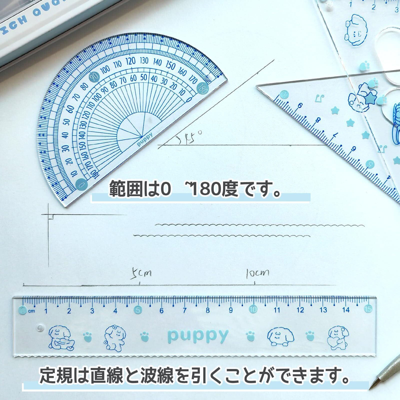 心をこめたデザイン:①半円分度器:左右どちらからでも角度を測れるように、両方から目盛りを付けました。②定規:5cmごとにカラーマークを施し、ウェーブデザインなので数字みやすい。③三角定規:30°と45°のマークがあり、区別しやすく、初心者に非常に適しています。