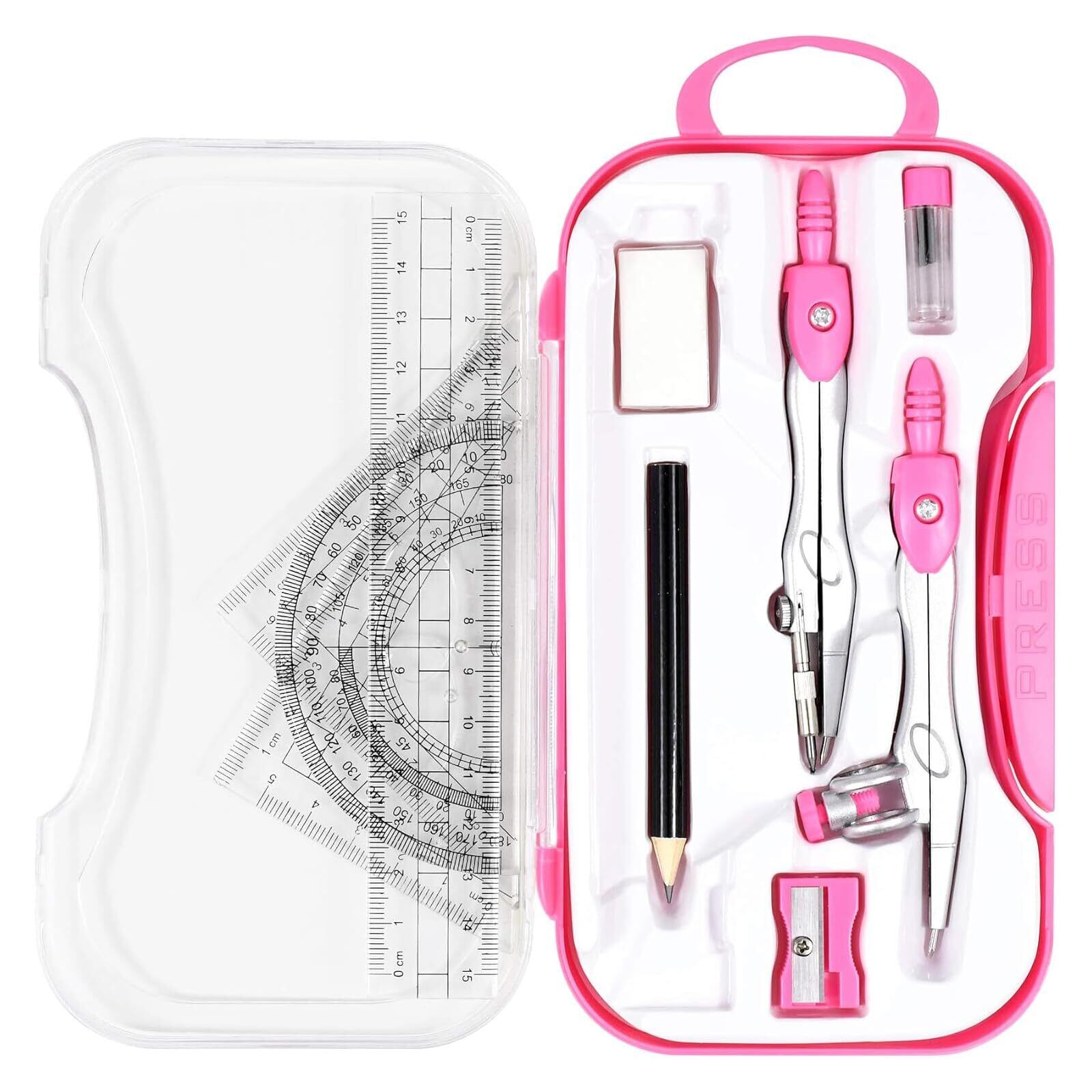 幾何学コンパスセット 10点セット 文具セット コンパス 定規 数学直定規 三⾓定規 半円分度器 替え芯 消しゴム 中学生 小学生用 クリアケース付 (ピンク)