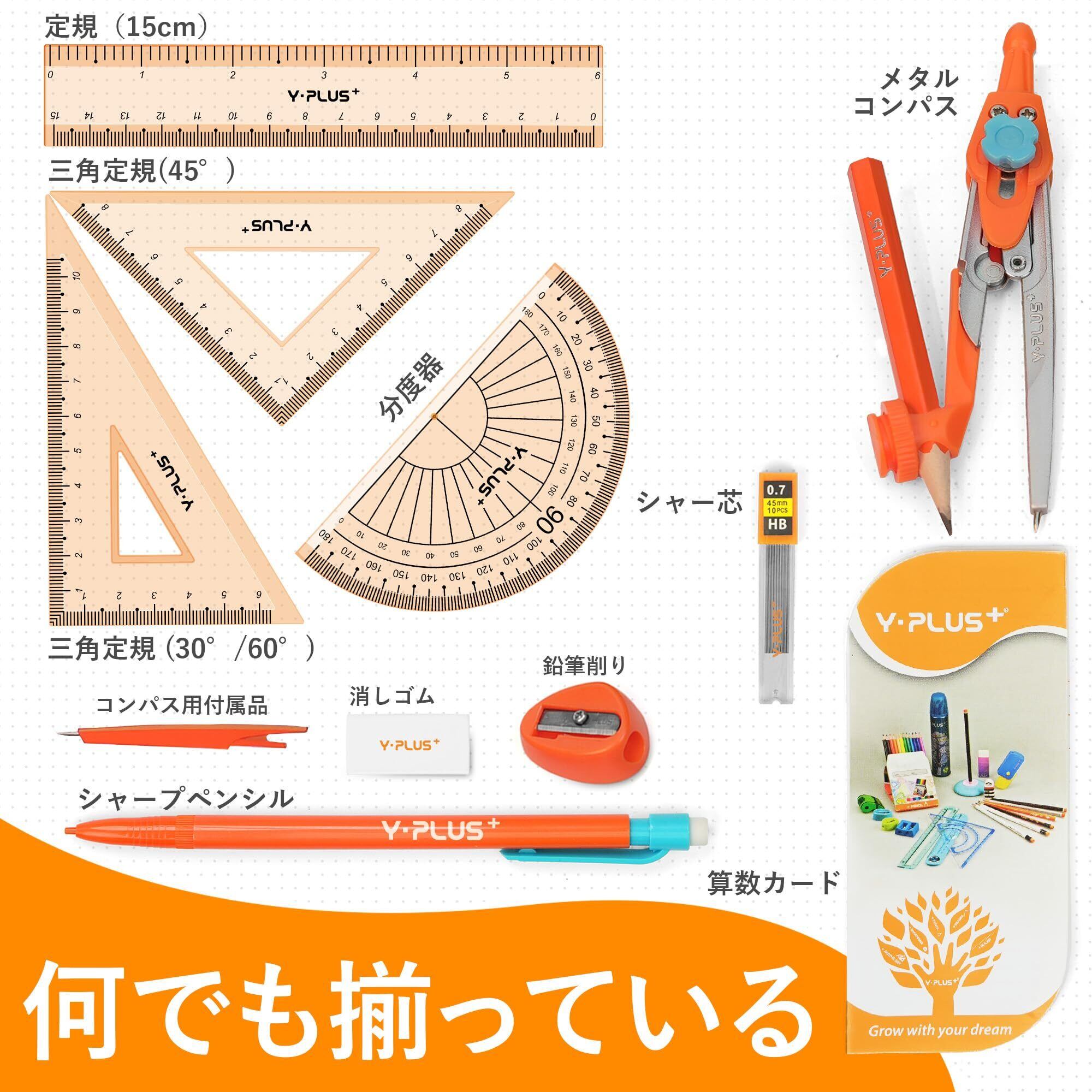 パッケージ内容:1本の定規(15cm)、1個の三角定規(30°/60°)、1個の三角定規(45°)、1個の金属製分度器、1本のシャープペンシル(0.5mm)、1パックの0.5mmシャープペンシル替芯、1個の消しゴム、1個の手動鉛筆削り、1個のコンパス、1本のコンパス用鉛筆。