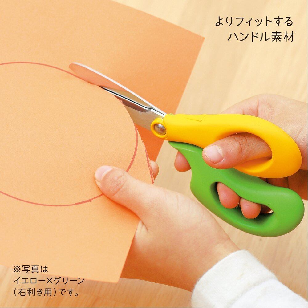 ハンドルの色は、イエローとグリーンの2色使い。親指を入れる小さい穴と、人差し指と中指を入れる大きい穴とで色を変え、正しい持ち方や指づかいがわかりやすいようツートンカラーのハンドルを採用しました。