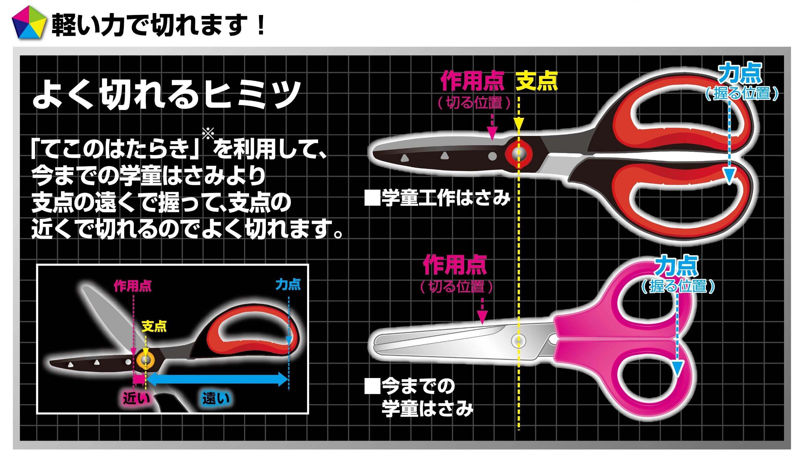 紙・工作用に適しており、テコの原理を利用しているため軽い力でよく切れる学童はさみ。