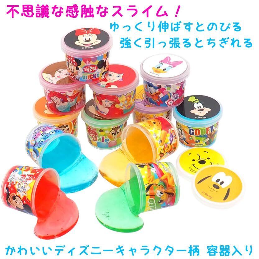 お子さま大好きスライム!ひんやり ムニュッと不思議な感触!スライムねんど!かわいい ディ ズ ニ ー キャラクター のミニ容器が12種類!ねんどは4色あります。コネコネ 混ぜ混ぜして遊べるよ!